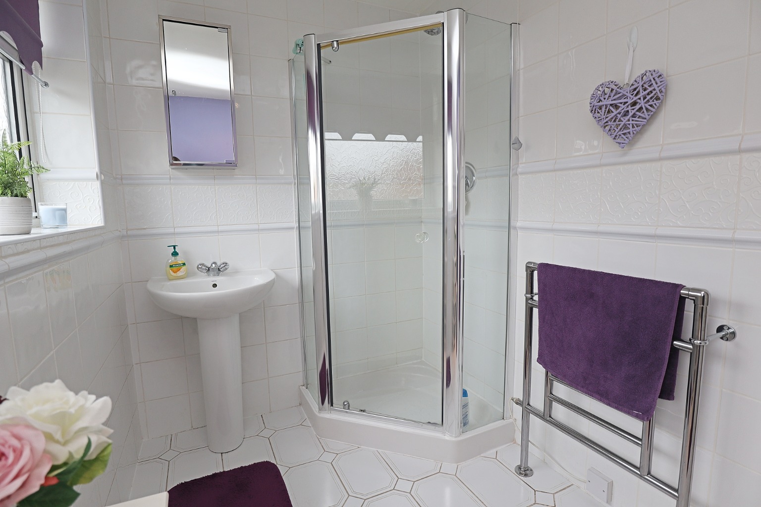 Shower Room9' 0" x 5' 7" (2.74m x 1.70m)Having a corner shower cubicle, pedestal wash hand basin and low level WC. Heated towel rail and upvc sealed unit double glazed window.