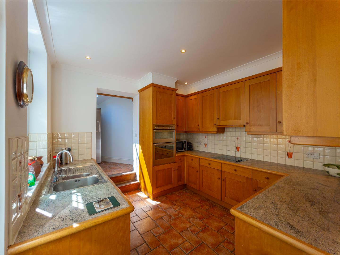 Kitchen - 3.23m x 3.15m (10'7" x 10'4") - Comprising a well equipped modern fitted kitchen with working top surfaces incorporating a one and a half bowl stainless steel sink with drainer and swan's neck mixer tap and Neff electric hob with hood over. There are a pleasing range of base cupboards and drawers, including twin carousel units, complimented by wall units with display shelves. Integrated appliances include an electric oven, grill and dishwasher. There are tiled splash backs, under counter lighting, recessed spotlighting, terracotta tiling to the floor, windows and a part glazed door to the inner courtyard. Steps up to the utility area.
