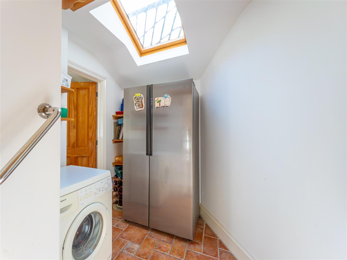 Utility Area (Of Irregular Shape) - Having space for a washing machine and freestanding American style fridge freezer. With useful shelving to the walls, corner shelving, Velux window, terracotta tiling to the floor and door to the cloakroom.