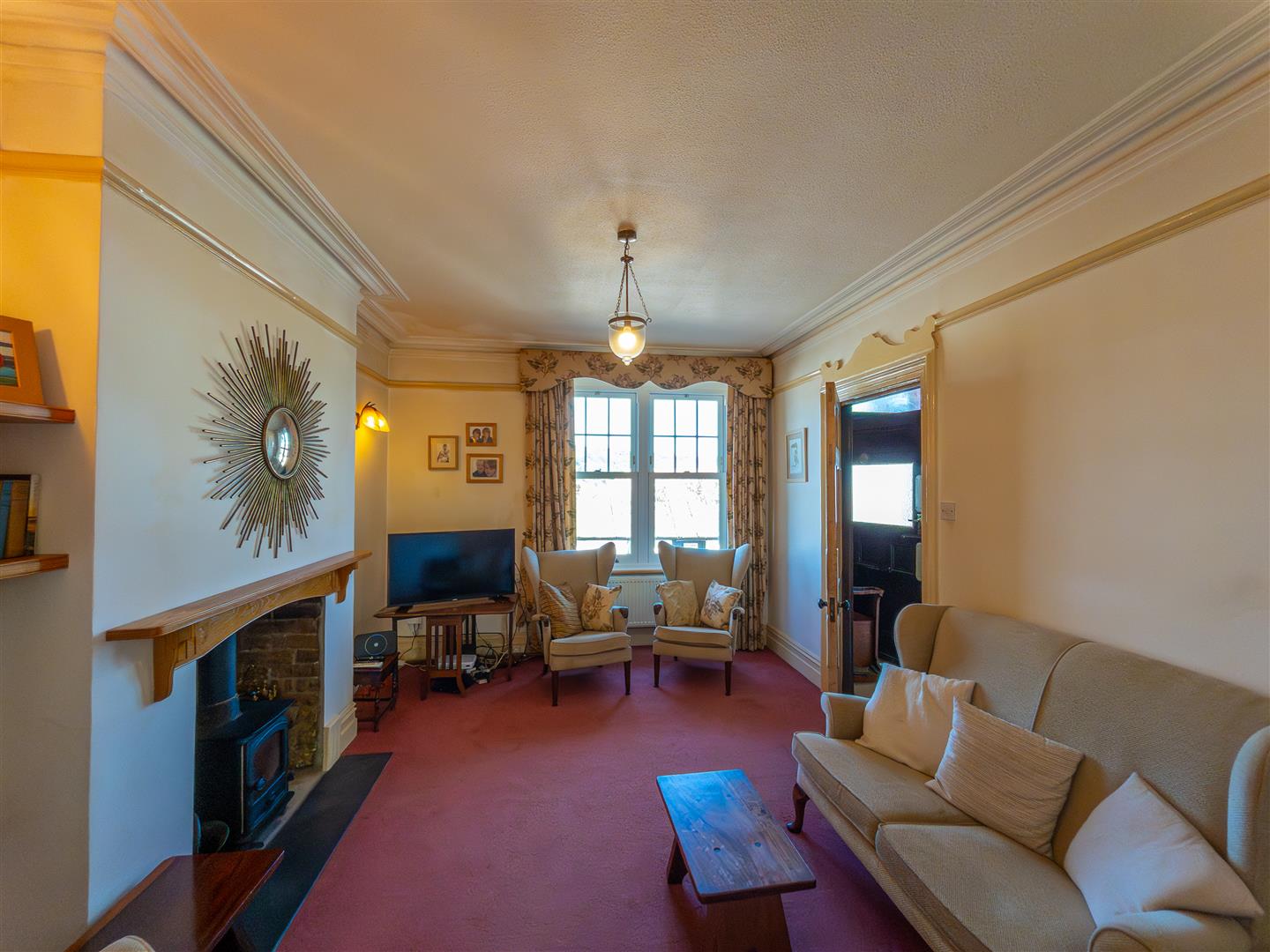 Sitting Room - 4.57m x 3.38m (including fireplace) (15' x 11'1" ( - Having a fireplace with wooden mantle, brick surround and slate hearth housing a woodburning stove and providing a lovely focal point for the room. This is complemented by ornate door architrave, picture rails and large twin sash windows with a fabulous outlook to the front, encompassing Coverack bay and beach. Sliding door to the breakfast room.