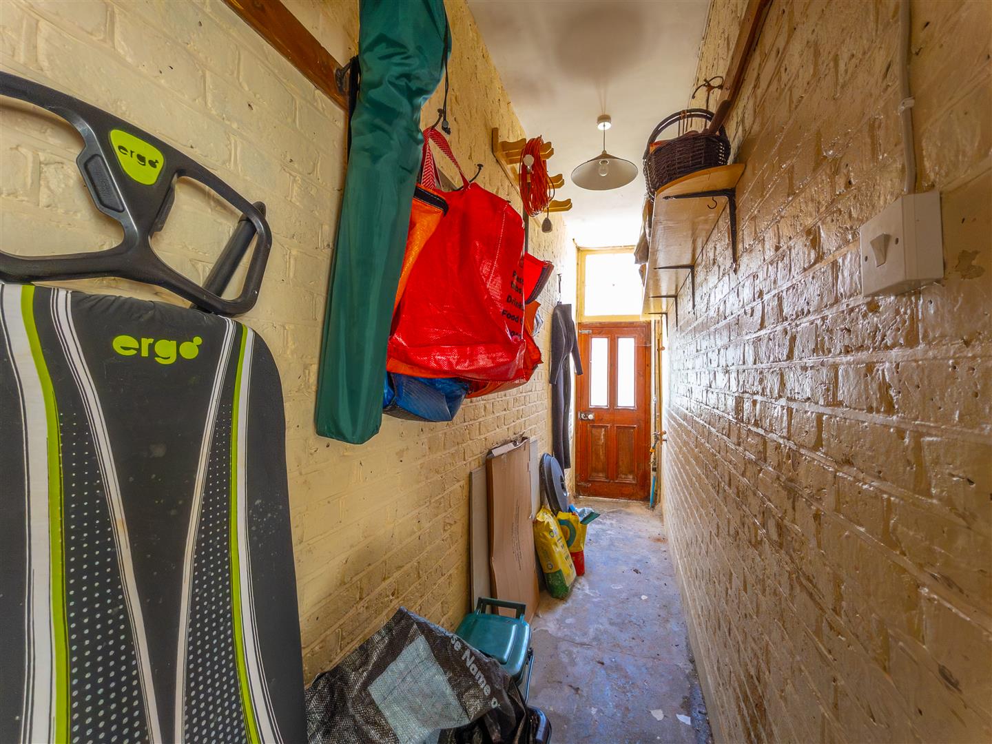 Side Entrance - With coat hanging rail, shelving, outside tap and part glazed side entrance door.