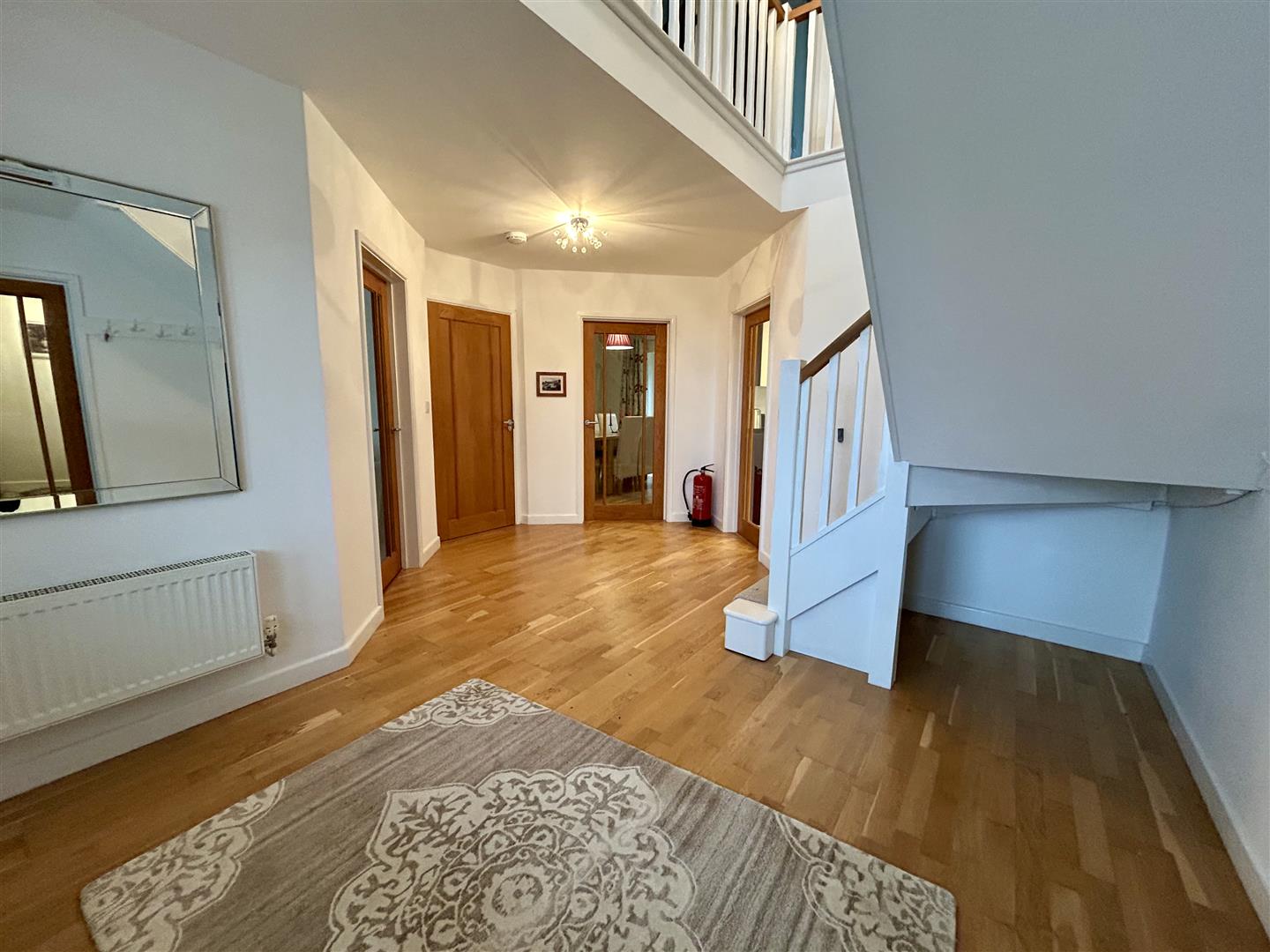 Entrance Hallway - An impressive space with engineered wood flooring and a turning staircase rising to the first floor with feature lights, as well as doors to -