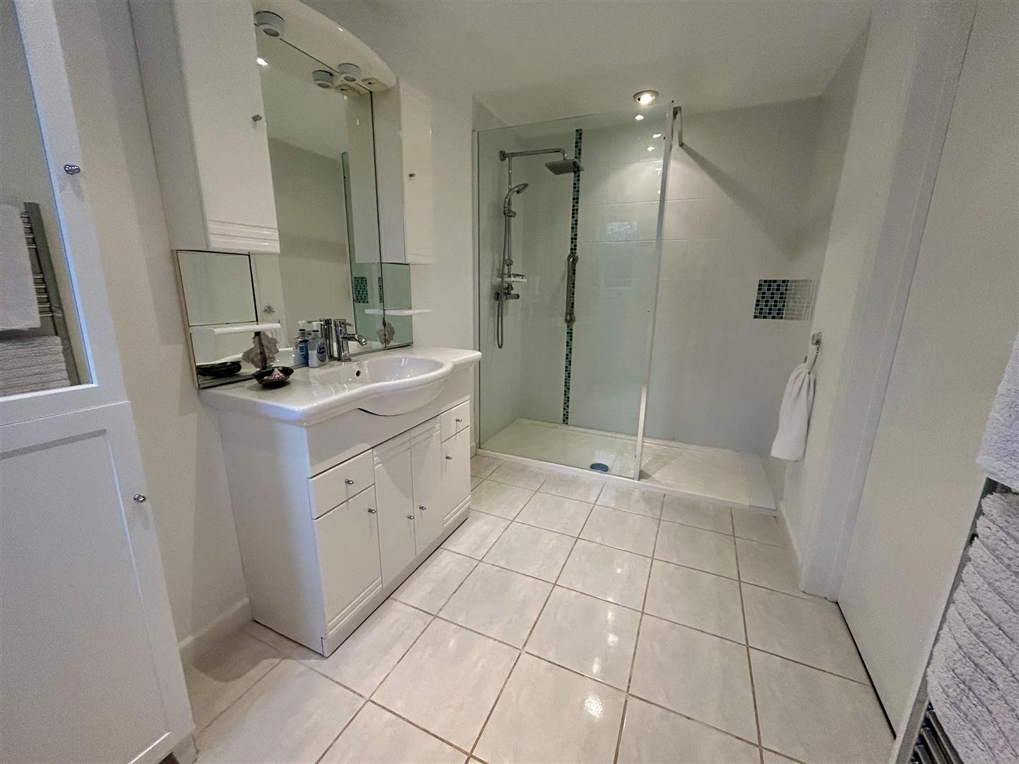 En Suite Shower Room - Beautifully appointed with a walk-in tiled and glazed shower cubicle with shower having large drencher head. Wash hand basin set into a vanity unit with storage under and lit mirror with further shelving and storage over, dual flush W.C., shaver socket, two obscured windows to the side aspect, ladder style chrome drying radiator, extractor, tiling to the floor and the room is lit by a series of down lighters.