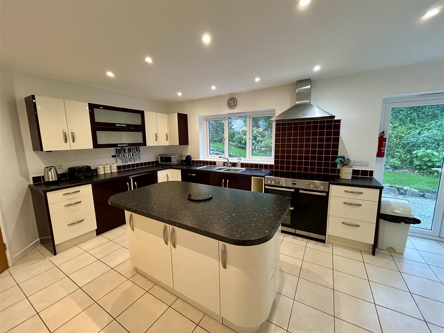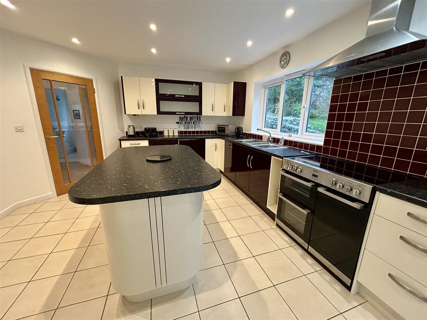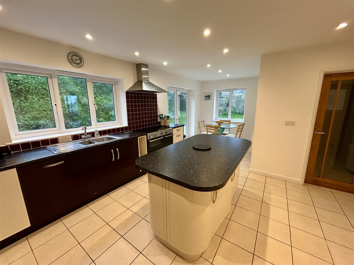 Kitchen/Breakfast Room - 6.5m x 4.40m (max measurments) (21'3" x 14'5" (max - A super space with smart fitted kitchen that comprises stone effect worktops incorporating a one and a half bowl stainless steel sink drainer with mixer tap and attractive tiled splash-back. There are a mixture of base and drawer units under with wall units over, a built in refrigerator and Belling electric range cooker with stainless steel chimney-style hood over, central island unit again with stone effect worktops and a number of storage cupboards under. Windows to the rear and side aspect overlooking the gardens, along with glazed French doors that also lead out. Tiling to the floor and the room is lit by a series of down lighters. With door to -