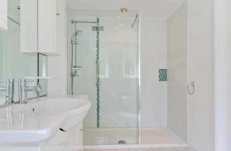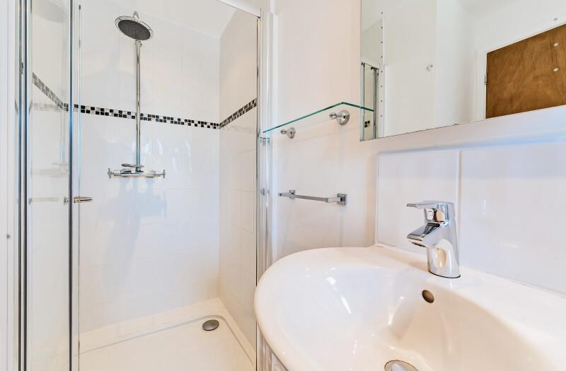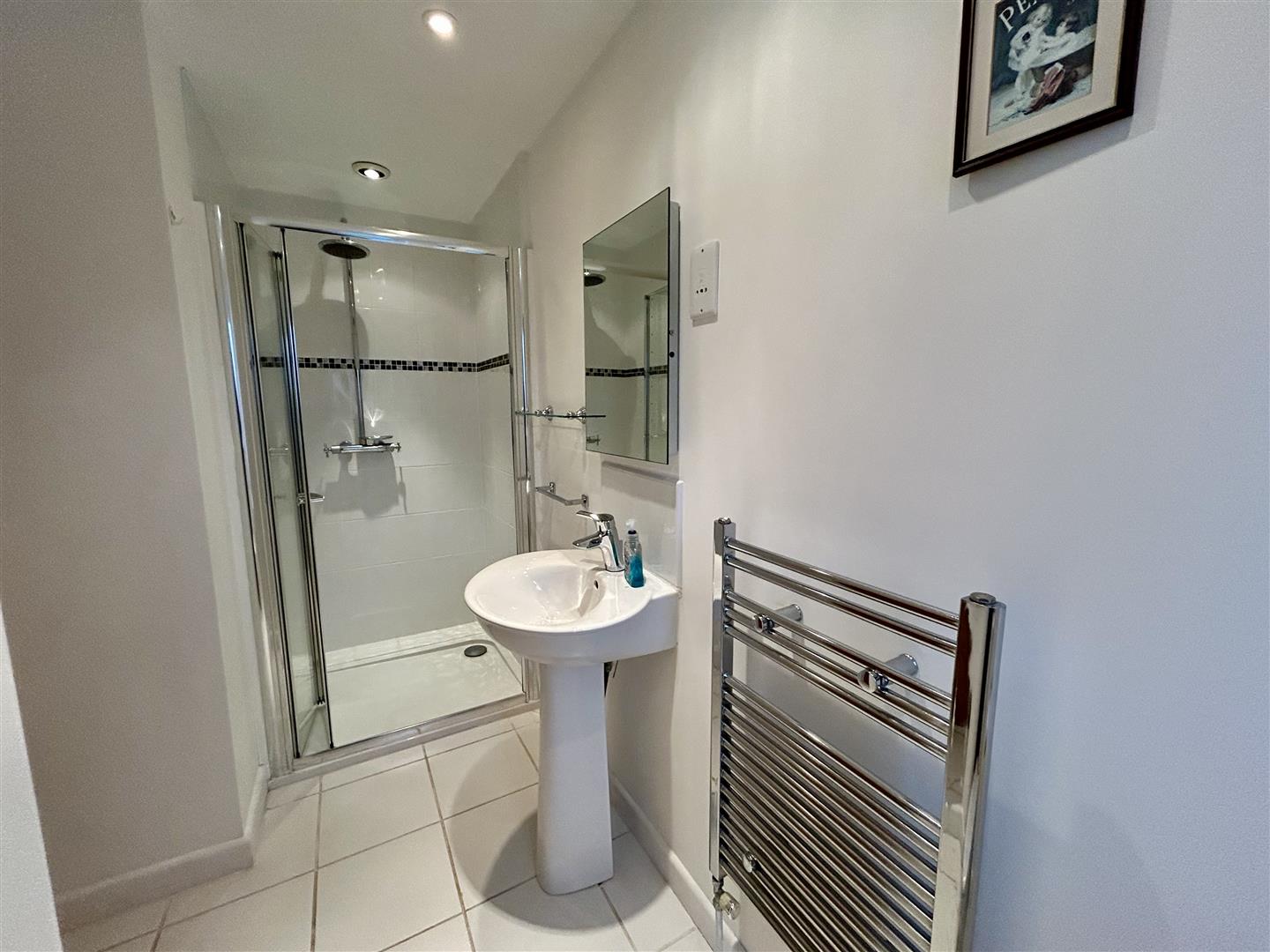 En-Suite Shower Room - Beautifully appointed with glazed and tiled walk-in shower cubicle, wash hand basin with mixer tap and tiled splashback with mirror over, dual flush W.C., feature glass shelf, chrome ladder style drying radiator, obscured window to the side aspect and tiling to the floor.