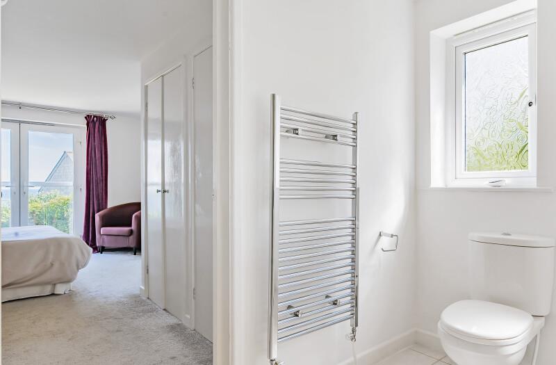 From the impressive hallway, a lovely turning staircase leads up to the galleried first floor landing which has a window to the front aspect enjoying a super marine and coastal outlook. There is an impressive, modern chandelier-style light and a cupboard with slatted shelving for linen. With doors to -