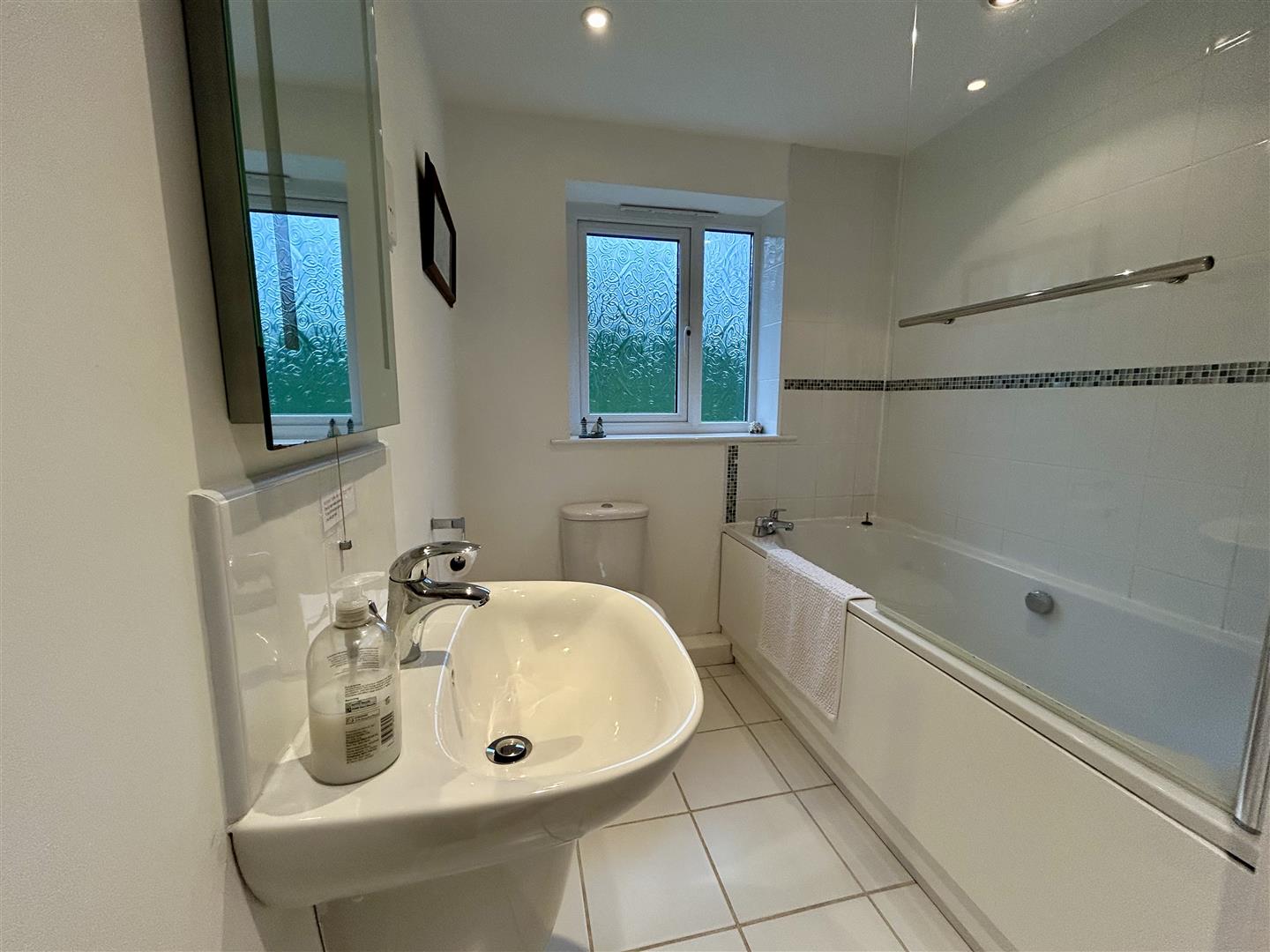Family Bathroom - Nicely appointed, featuring a panelled bath with mixer tap and a mixer shower arrangement over, with a tiled splashback and glass shower screen. Dual flush W.C., wash hand basin with mixer tap having a tiled splash-back and feature lit mirror over. Obscured glazed window to the rear aspect, shaver socket, tiling to the floor, extractor and the room is lit by a series of down lighters.