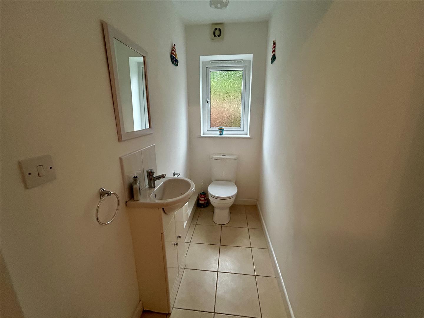 Cloakroom - Wash hand basin set into a vanity unit with mixer tap, tiled splash-back, dual flush W.C., window to the side aspect, extractor and tiling to the floor.