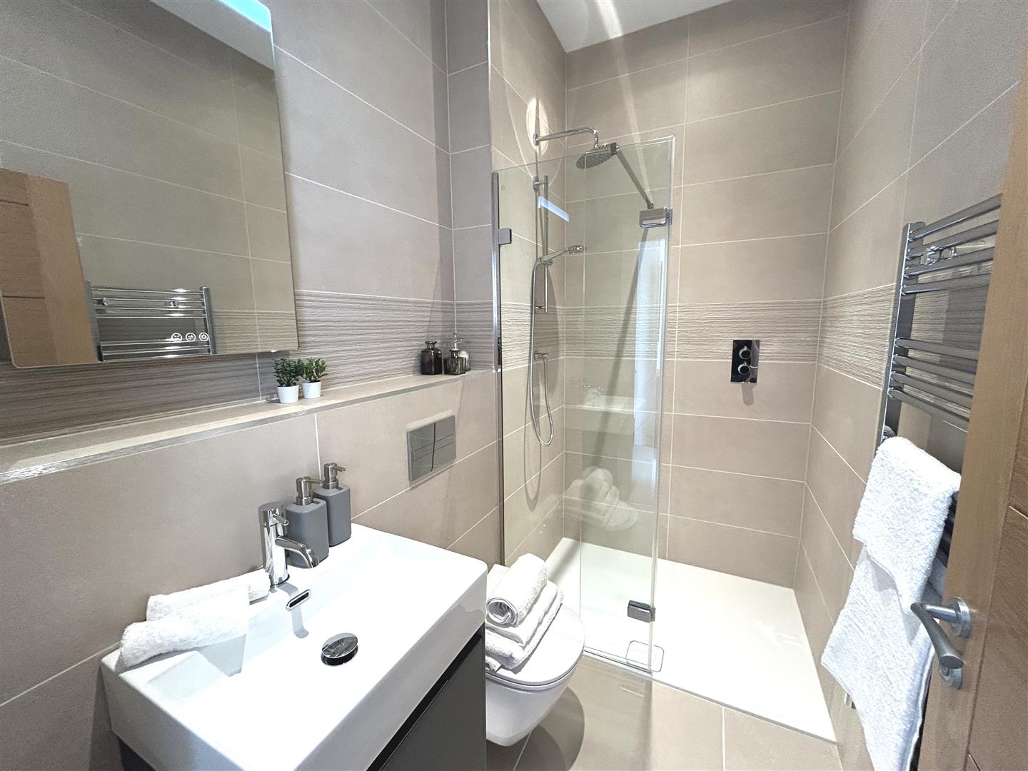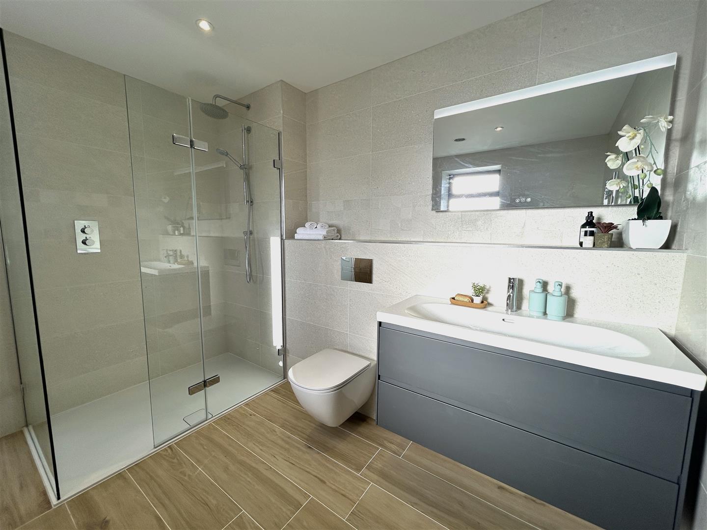 En-Suite - The en-suite boasts an indulgent shower cubicle with shower which has both a rain and flexible shower head. A freestanding bath. W.c. with concealed cistern and wall mounted wash basin with mixer tap over and drawer under. There is a heated towel rail, tiled walls, tiled floor and a mirror with touch sensitive controls. The room has low level motion sensored decorative lighting.