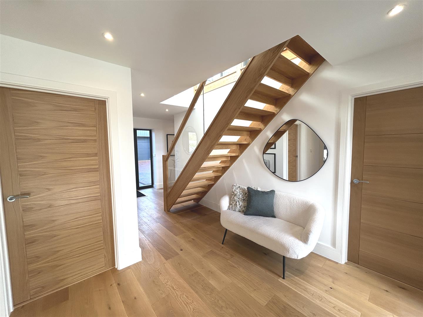 Hall - With engineered oak floor, built-in cupboards one of which houses the water cylinder and boiler, outlook to both the front and rear and a door to the rear garden. Doors to various rooms open from the hall and a stylish open tread staircase with glass balustrading ascends to the first floor.