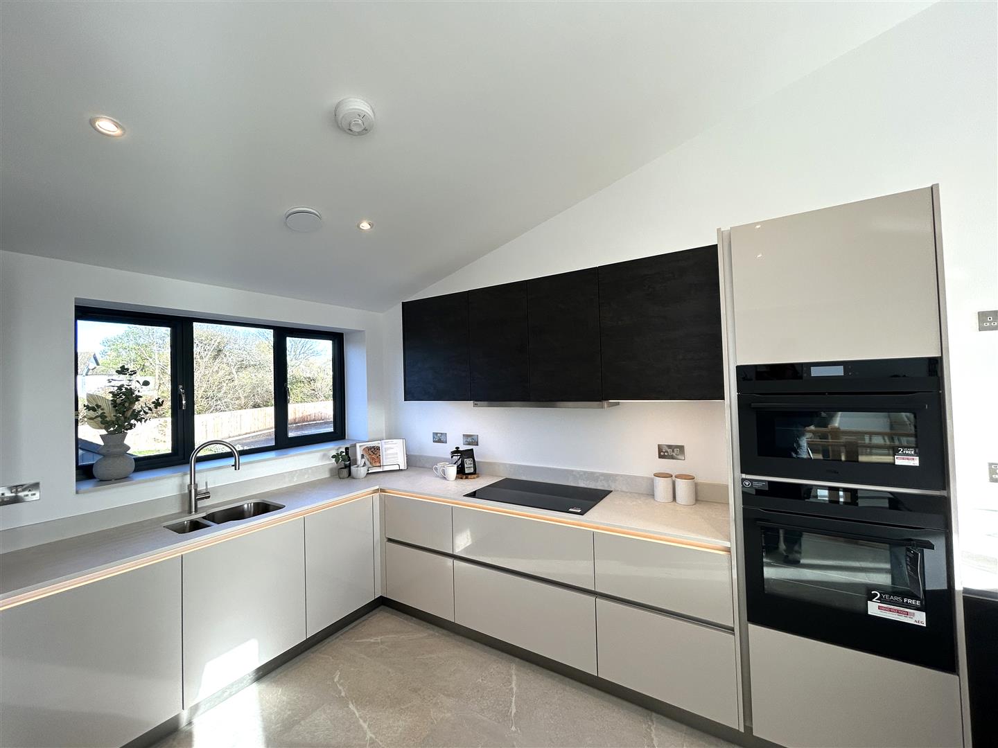 Kitchen Area - A contemporary kitchen comprising working top surfaces, incorporating a one and half bowl sink unit with drainer and mixer tap over, cupboards and drawers under and wall cupboards over. An array of built-in appliances include an oven, microwave, hob with hood over, dishwasher, fridge/freezer and a wine cooler. There is an outlook to the front and rear and a Juliette balcony takes full advantage of the sea views over other properties. There is a door to the snug and a door to the utility room. Overall a high end kitchen which is visually striking and offering a real 'wow' factor!