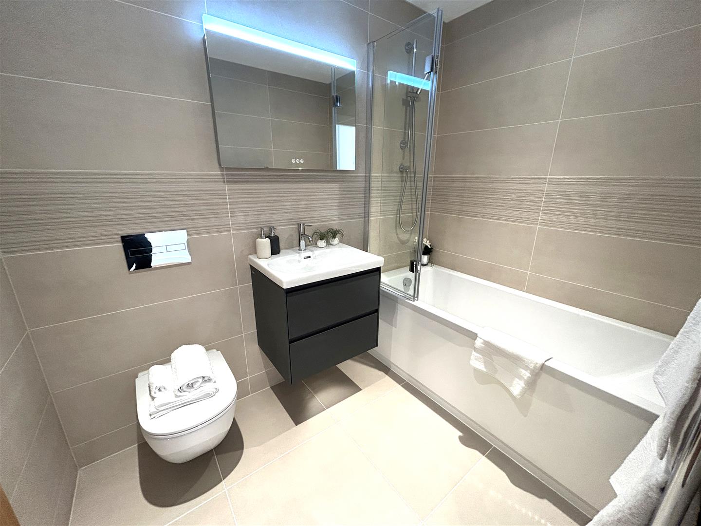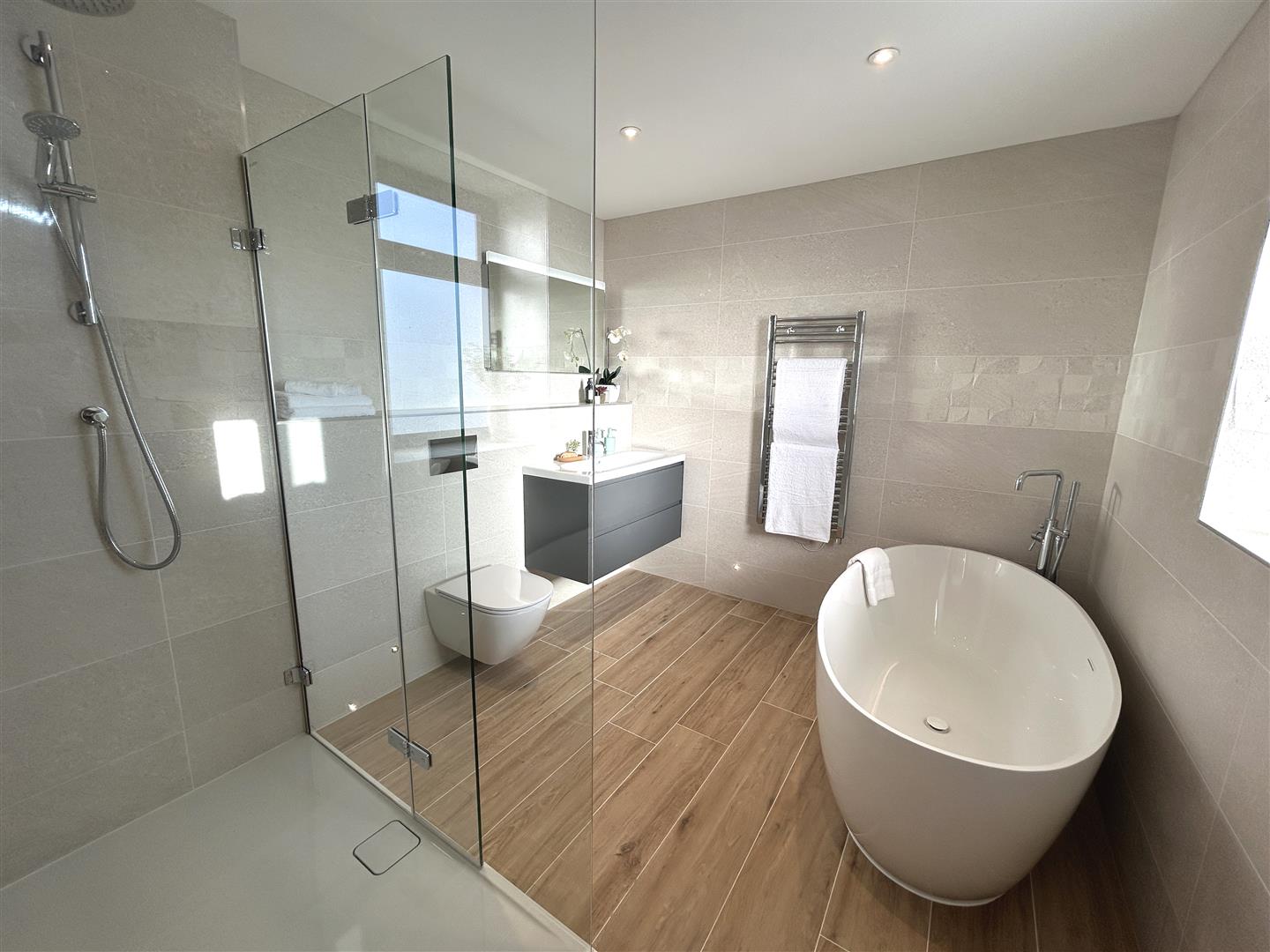 En-Suite - An attractive bathroom comprising a free standing bath, with mixer tap and flexible shower hose over, a wall mounted wash basin with mixer tap over and cupboards under, close coupled w.c. with concealed cistern and a shower cubicle with both rain and flexible shower head. There are tiled walls, tiled floor, heated towel rail, mirror with touch sensitive controls, obscure window to the rear and motion sensored low level decorative lighting.