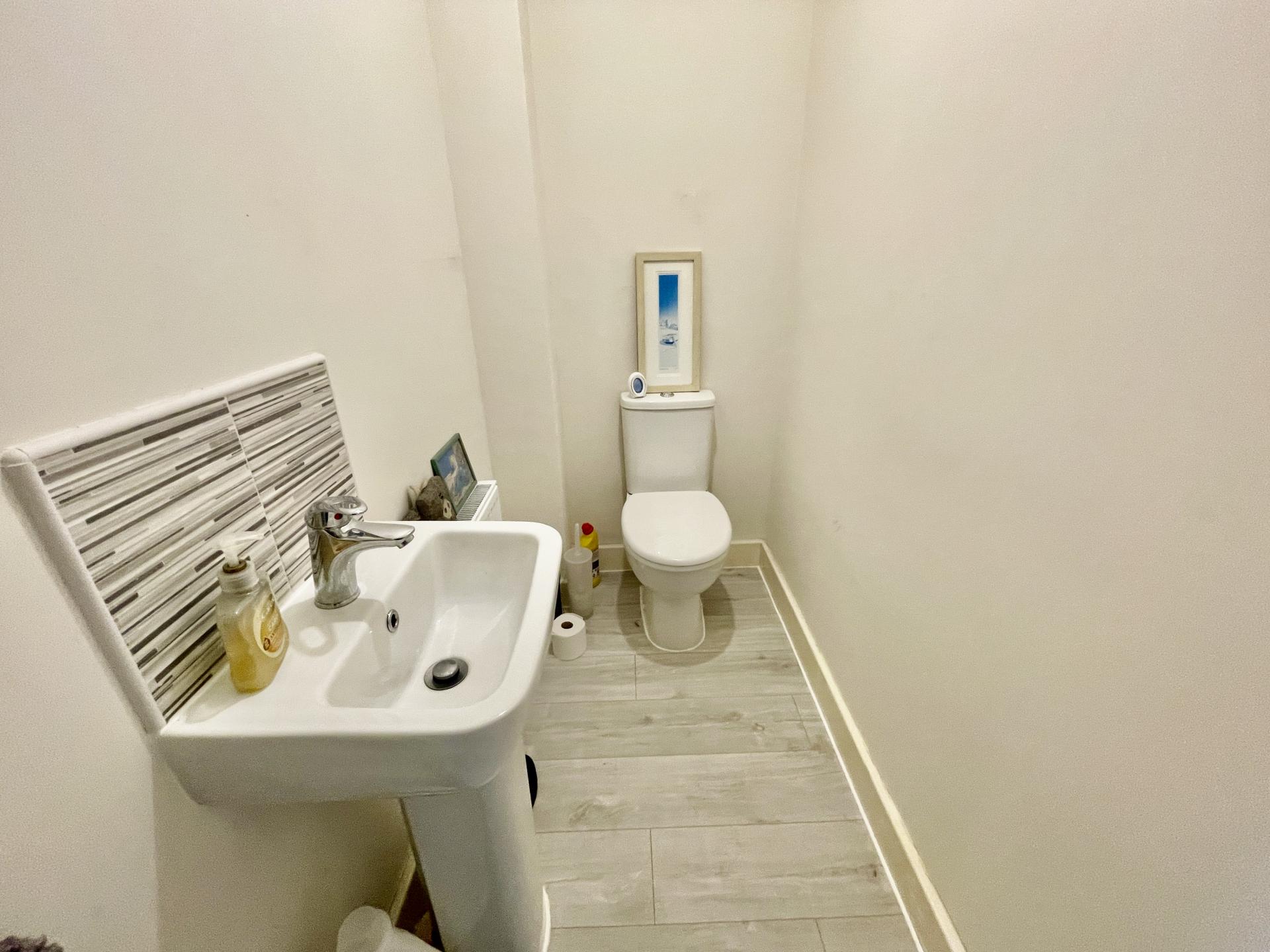CLOAKROOM 3' 4" x 6' 1" (1.02m x 1.86m) Skimmed ceiling, extractor fan, radiator, fitted with a two piece suite comprising low level WC, pedestal wash hand basin with mixer tap, tiled splashbacks, plank style laminate flooring.