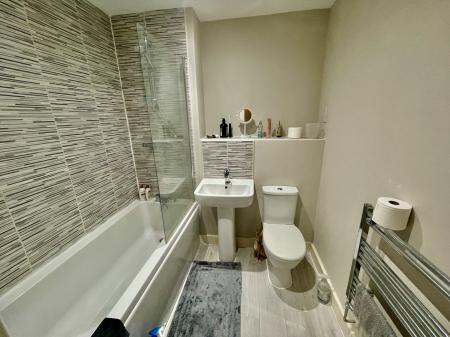 FAMILY BATHROOM 6' 4" x 6' 5" (1.95m x 1.96m) Skimmed ceiling, inset LED lighting, extractor fan, vinyl plank wood flooring, stainless steel heated towel rail, fitted with a three piece suite comprising low level WC, pedestal wash hand basin with mixer tap, tiled splashbacks and shaver point, bath with shower screen, mixer tap and thermostatic shower fitted over.