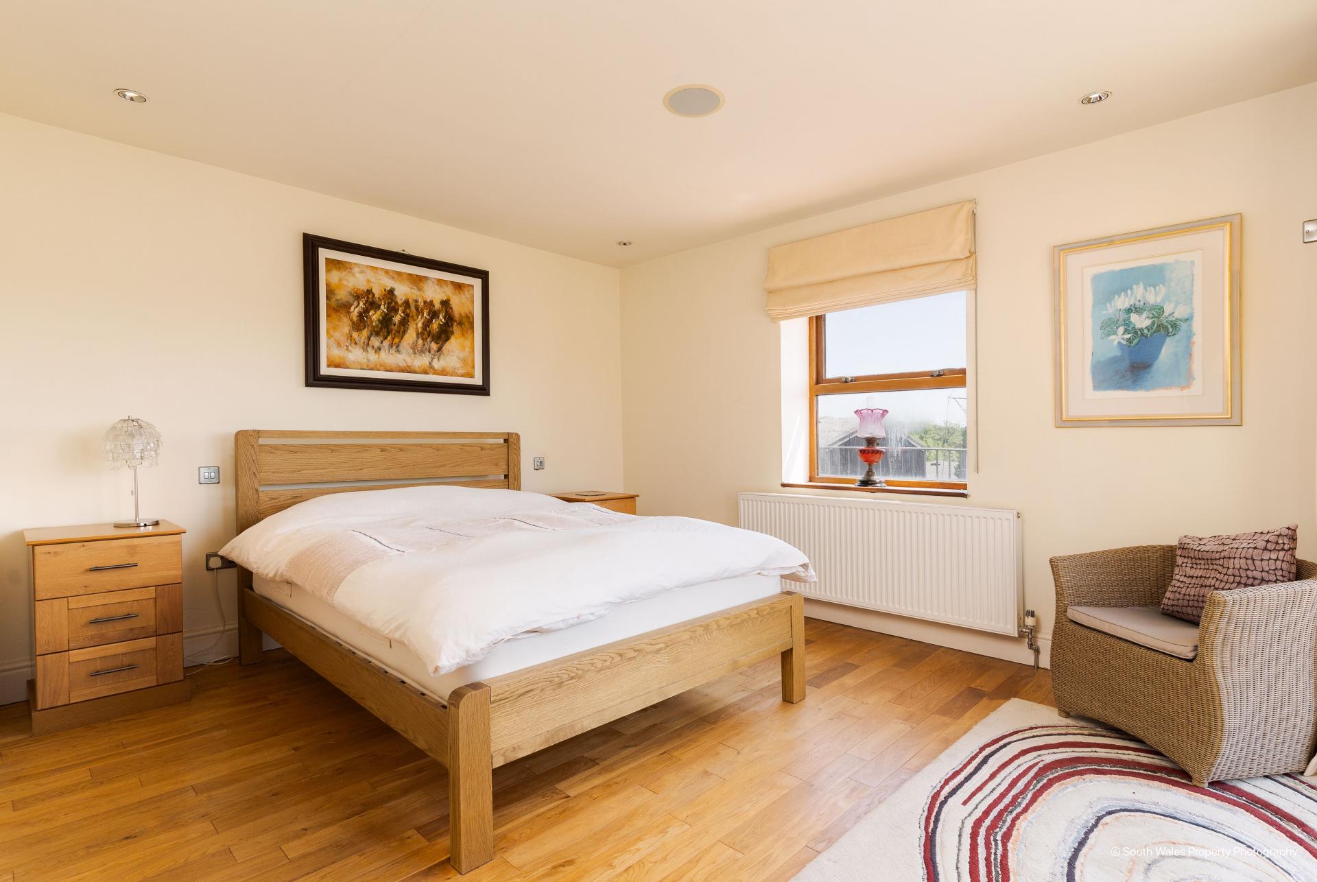 The principal bedroom suite is a spacious, south facing triple aspect double bedroom with oak flooring and bifold doors opening to an ‘L’-shaped balcony with countryside views. It includes a large walk-in wardrobe and airing cupboard with ample storage plus a tiled ensuite double shower featuring a wall-hung WC and sink.