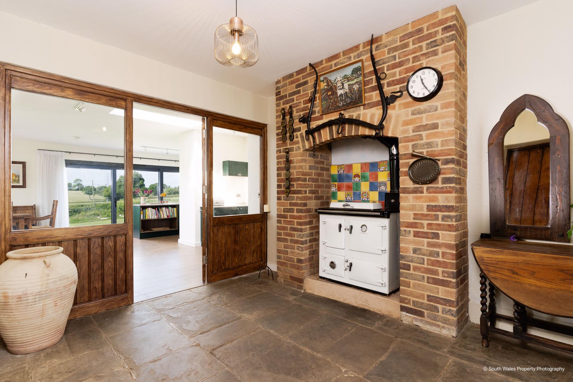 An external slate porch with timber door leads into a small hall plus WC. The inner hall features flagstone flooring and a Rayburn set in a brick fireplace.