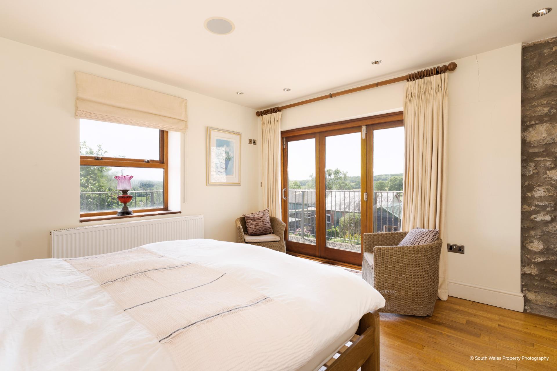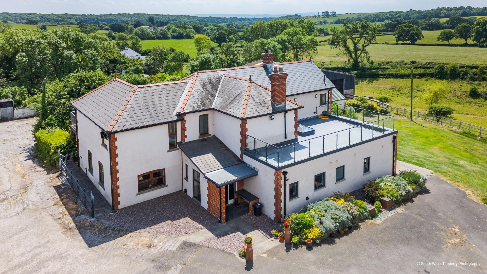 A glazed door from the landing opens to a large flat roof terrace with an enclosed glass and metal balustrade, offering superb views across the adjoining farmland at Tyn Y Coed Farm and countryside.