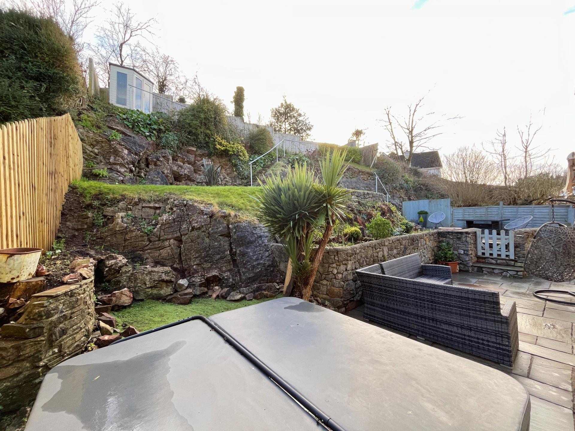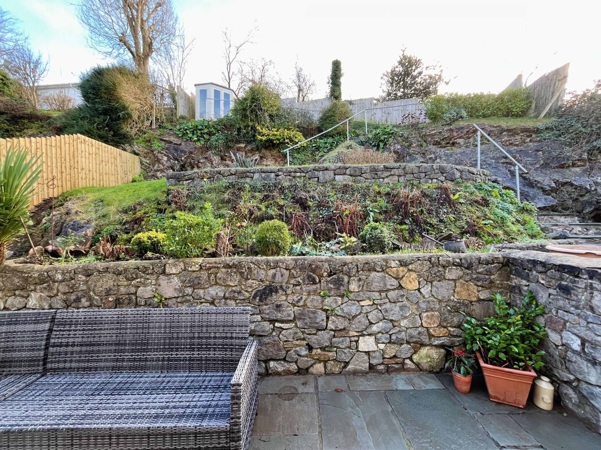 - Tiered south-facing rear garden with elevated views from the summerhouse.