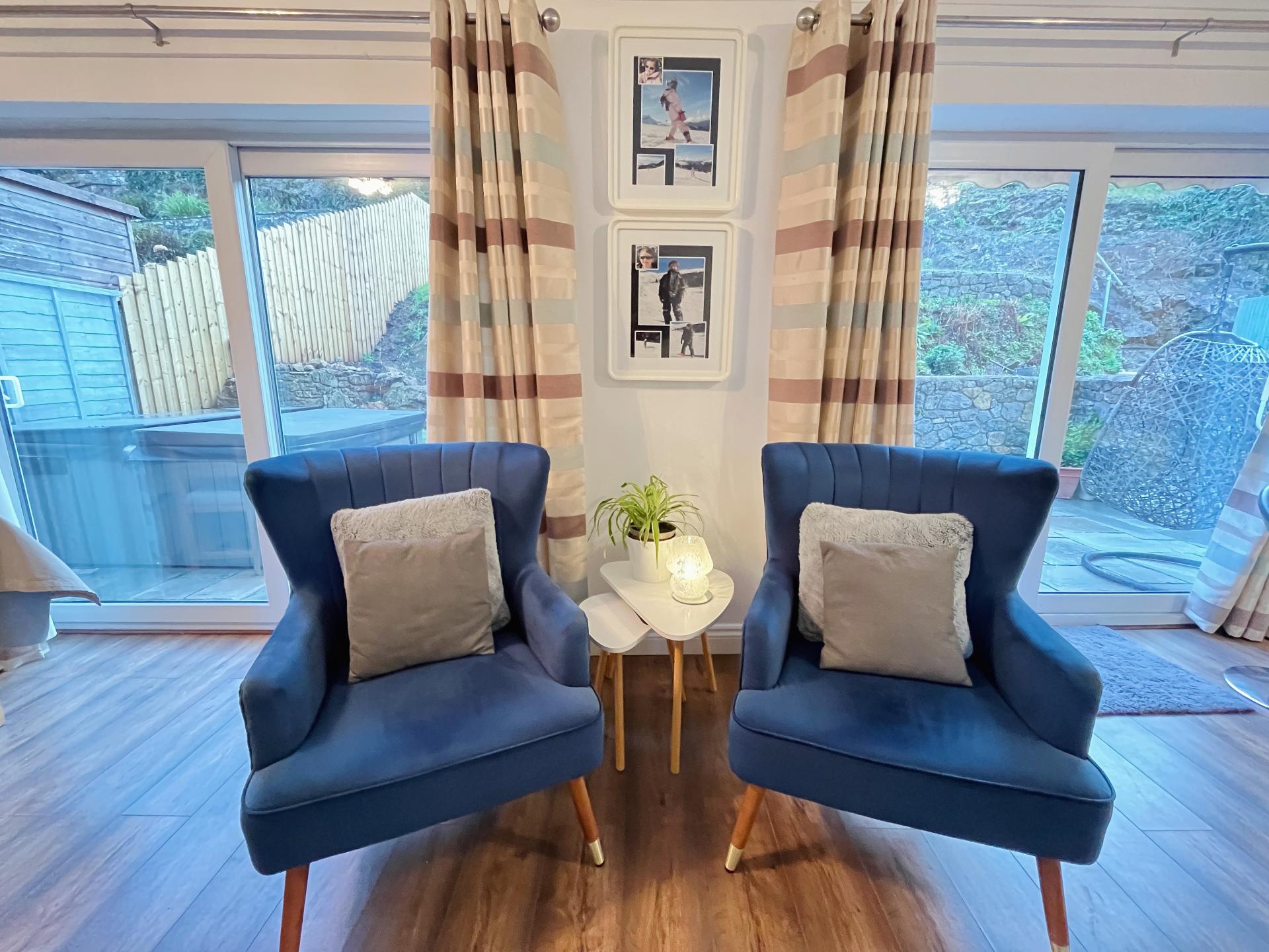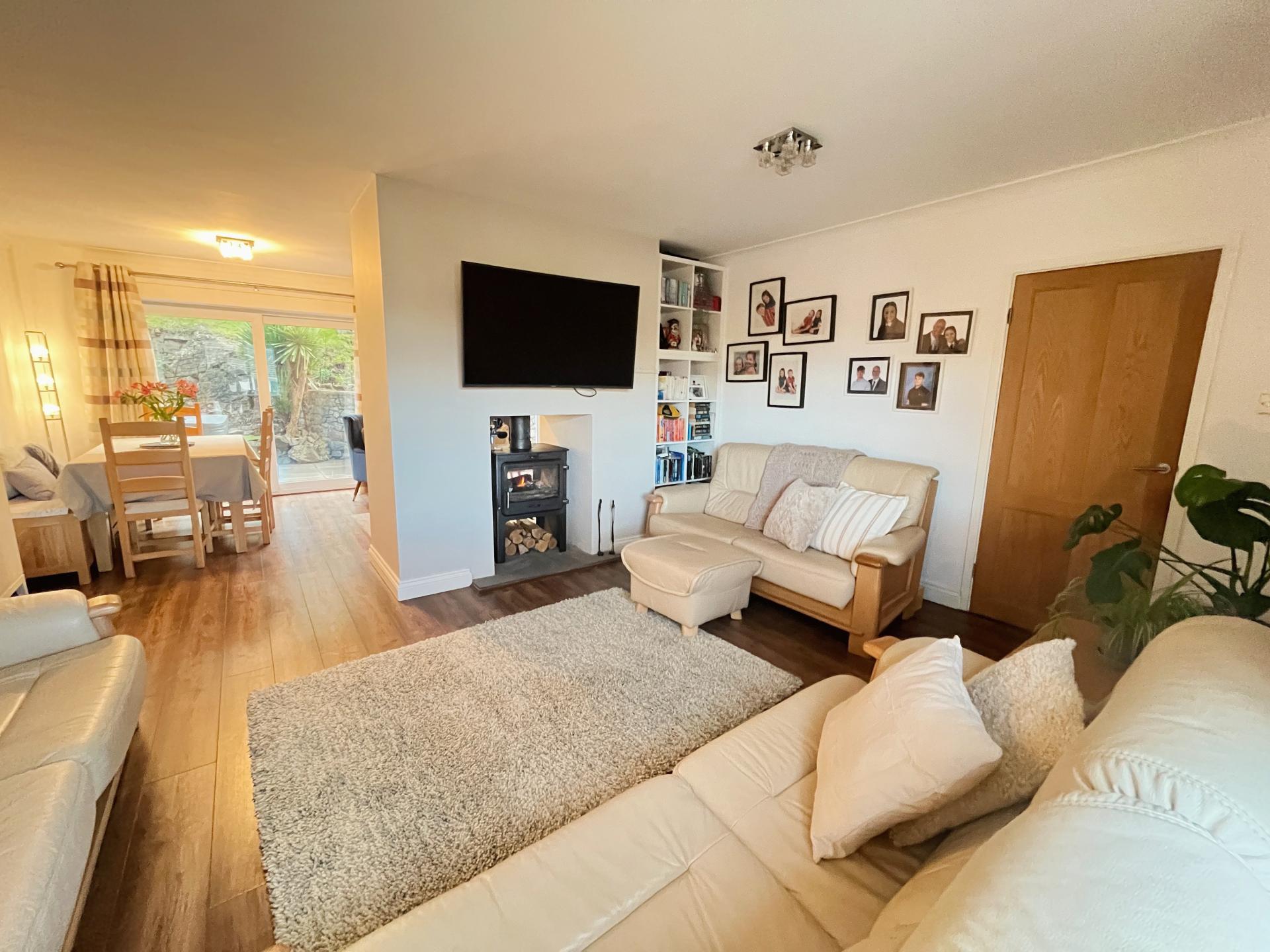 - Entrance porch and hallway, cloakroom, living room and dining room with double-sided wood-burning fire, separate sitting room, open-plan modern fitted kitchen, and utility room.