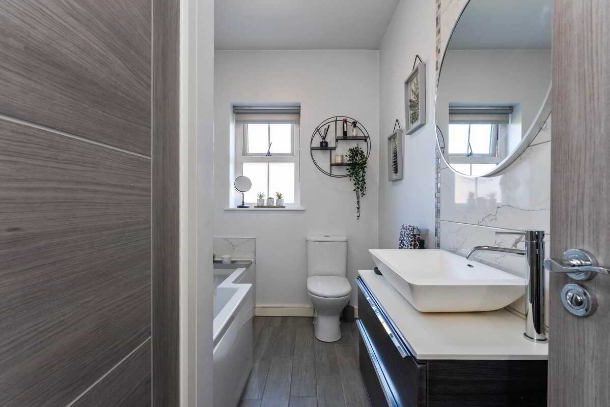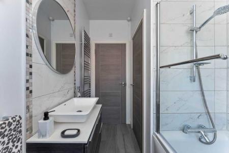 The main bathroom is sleek and modern, with a shower over the bath and fresh, clean finishes.