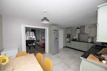 A solid, fully fitted kitchen with integrated appliances, open to the dining area and sunroom.