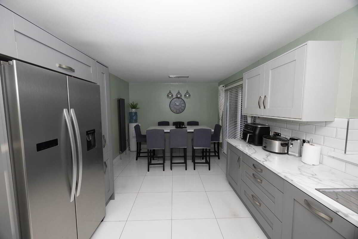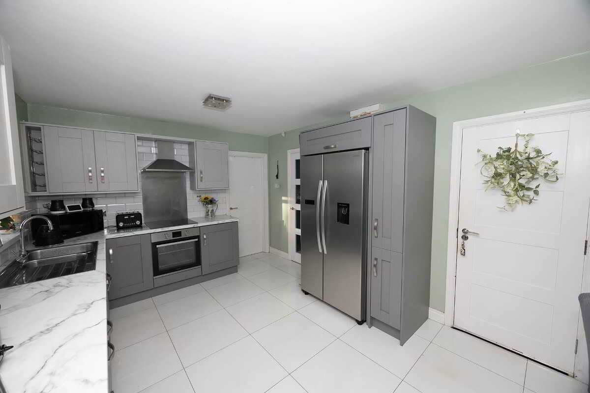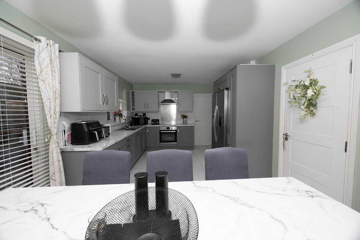 The kitchen is where style meets practicality, finished with two-tone grey and white units and marble-effect worktops, creating a contemporary and inviting space. It features a subway tile splashback, integrated dishwasher, integrated hob and oven, and patio doors opening directly to the rear garden, making it ideal for everyday family life, casual breakfasts and entertaining alike.