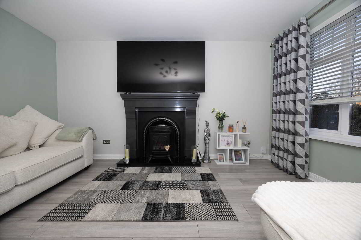 The main lounge is a space you`ll truly fall for, featuring a black open fire set within a marble fireplace, perfect for cosy evenings in. The grey laminate flooring continues here, tying the space together with modern elegance.
