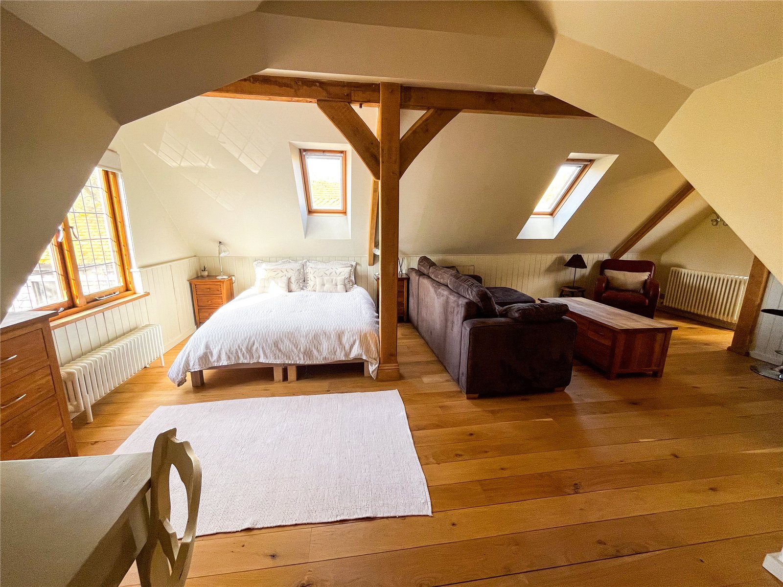 GUEST SUITE BEDROOM SIX / AIR BNB WING, WHICH IS ALSO LOCATED OFF THE FIRST FLOOR MAIN STAIRCASE & ALSO ACCESSED BY AN OUTSIDE STIARCASE FROM THE REAR GARDENS: A fabulous suite comprising of a large double aspect and double sized bedroom with oak floors, a feature vaulted oak ceiling, further oak pillars, downlighting, an open plan lounge, attractive cottage style panelled walls, vintage style radiators, open plan area leading to an adjoining kitchen / breakfast room and bathroom / shower room.
