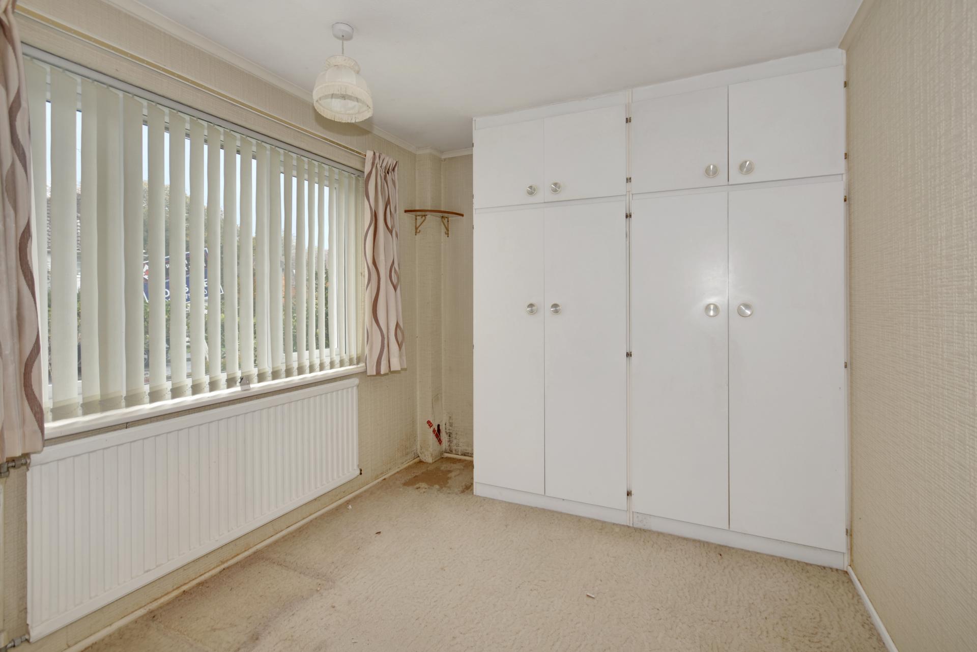 Bedroom Two: Double glazed window to the front with vertical blinds. Fitted with range of wardrobe cupboards.
