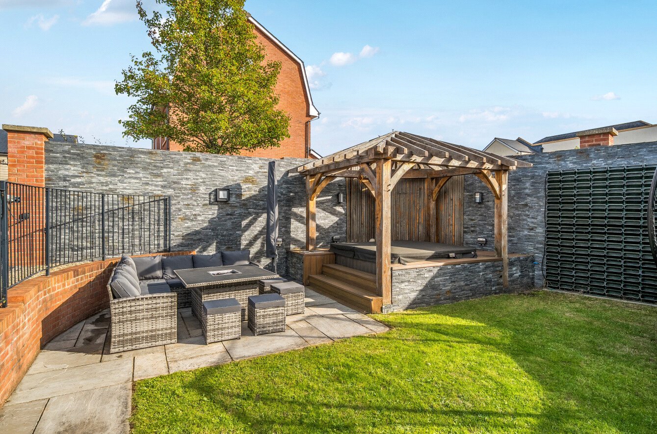 Outside, the property is approached from the rear via a gated, double-width driveway providing ample parking. The rear garden is a private and inviting space, featuring a lawn, two patios ideal for dining or relaxing, a pergola with hot tub, and outdoor lighting with EV charging point. The double garage has twin remote control doors, power, light, and internal access to the utility, making it both practical and convenient.