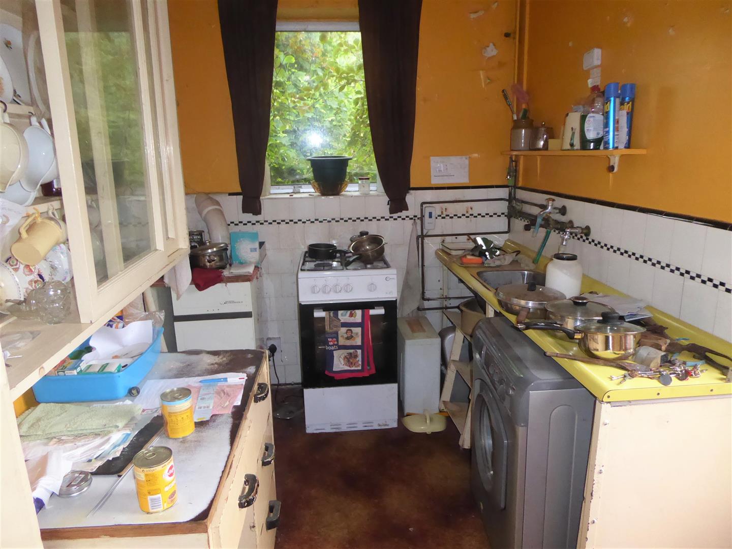 Kitchen - Single drainer sink unit with mixer tap, wall mounted unit, space for cooker and washing machine, floor mounted boiler, part tiled walls, rear aspect window, larder cupboard and door to garden.
