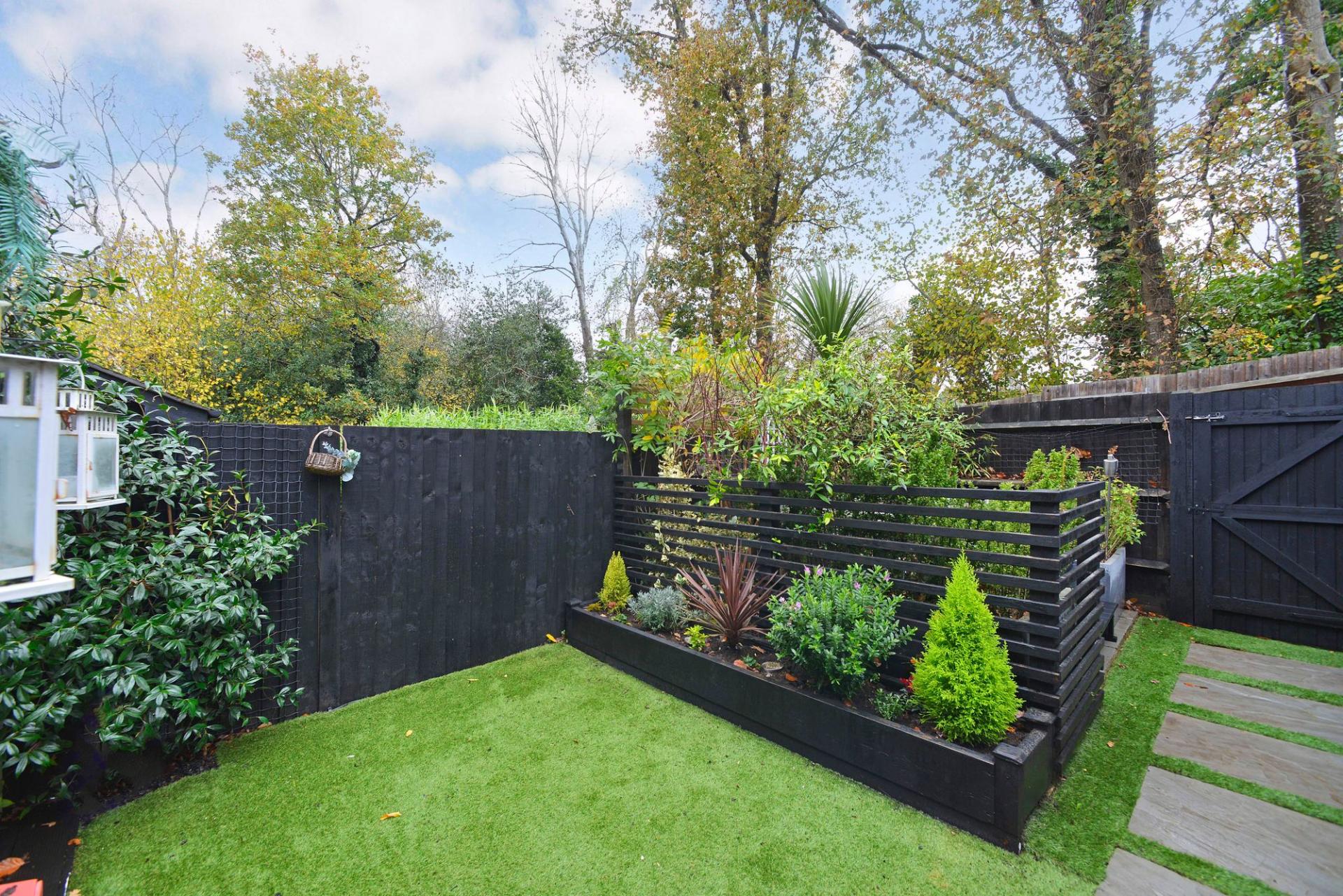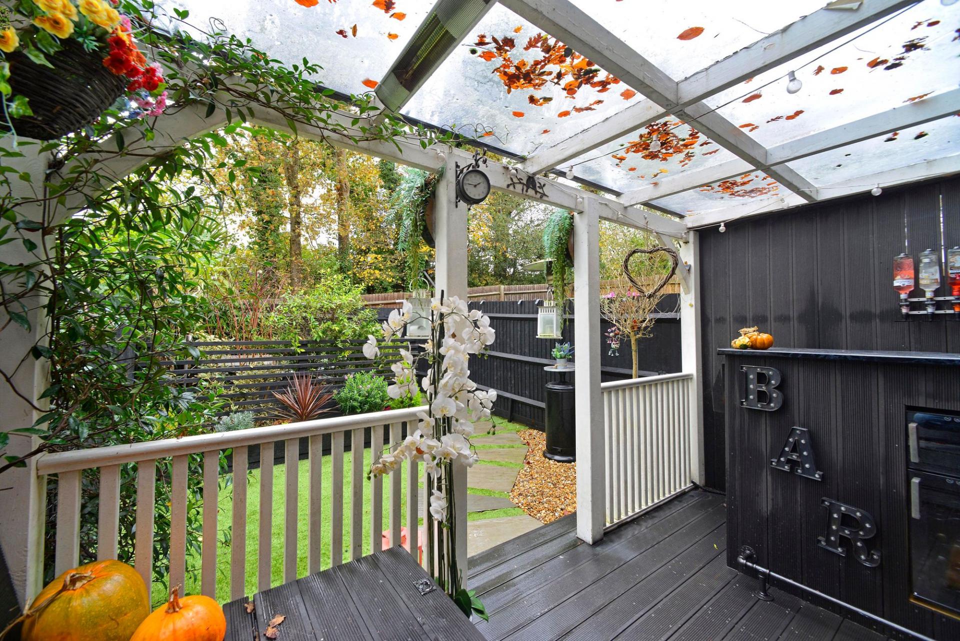 Additional features include modern gas-fired central heating and attractive grey double-glazed windows. Outside, the property offers two private parking spaces, an electric car charging point, and gated rear access to the rear garden. The garden itself is thoughtfully landscaped with a covered veranda and patio adjoining the house, a central lawn, and a further area of garden currently housing a hot tub.