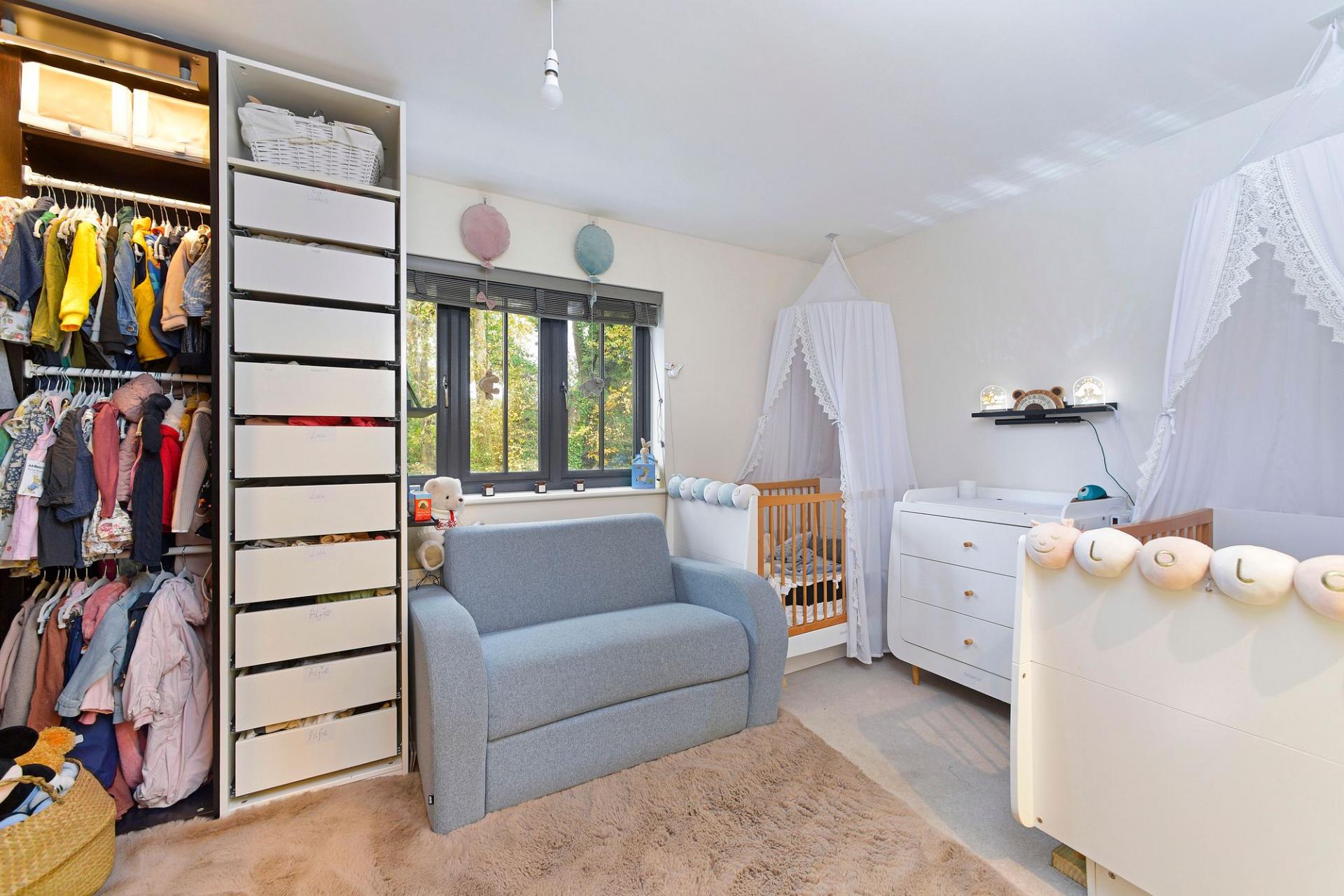 Inside, the home offers a warm and welcoming atmosphere. An entrance hall leads to a cloakroom and a generous walk-in coats cupboard. The fully fitted kitchen is sleek and well-equipped, featuring integrated appliances including a dishwasher, washing machine, fridge, freezer, hob, and double oven. To the rear, a spacious double-aspect sitting room opens onto the garden via French doors and includes a further walk-in storage cupboard.