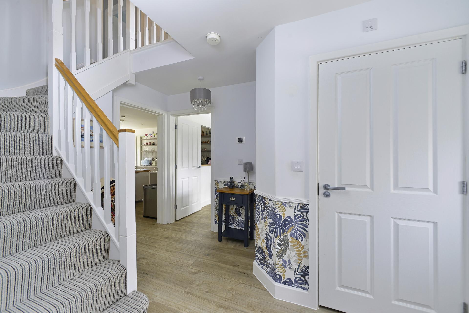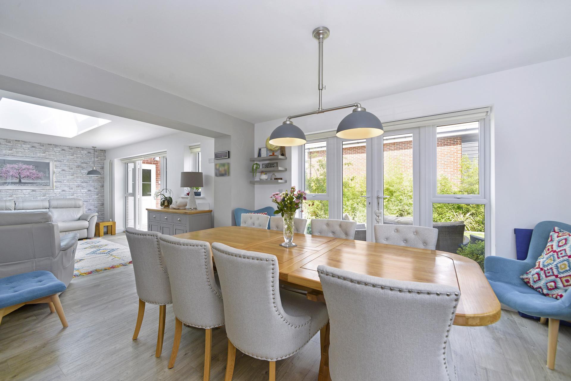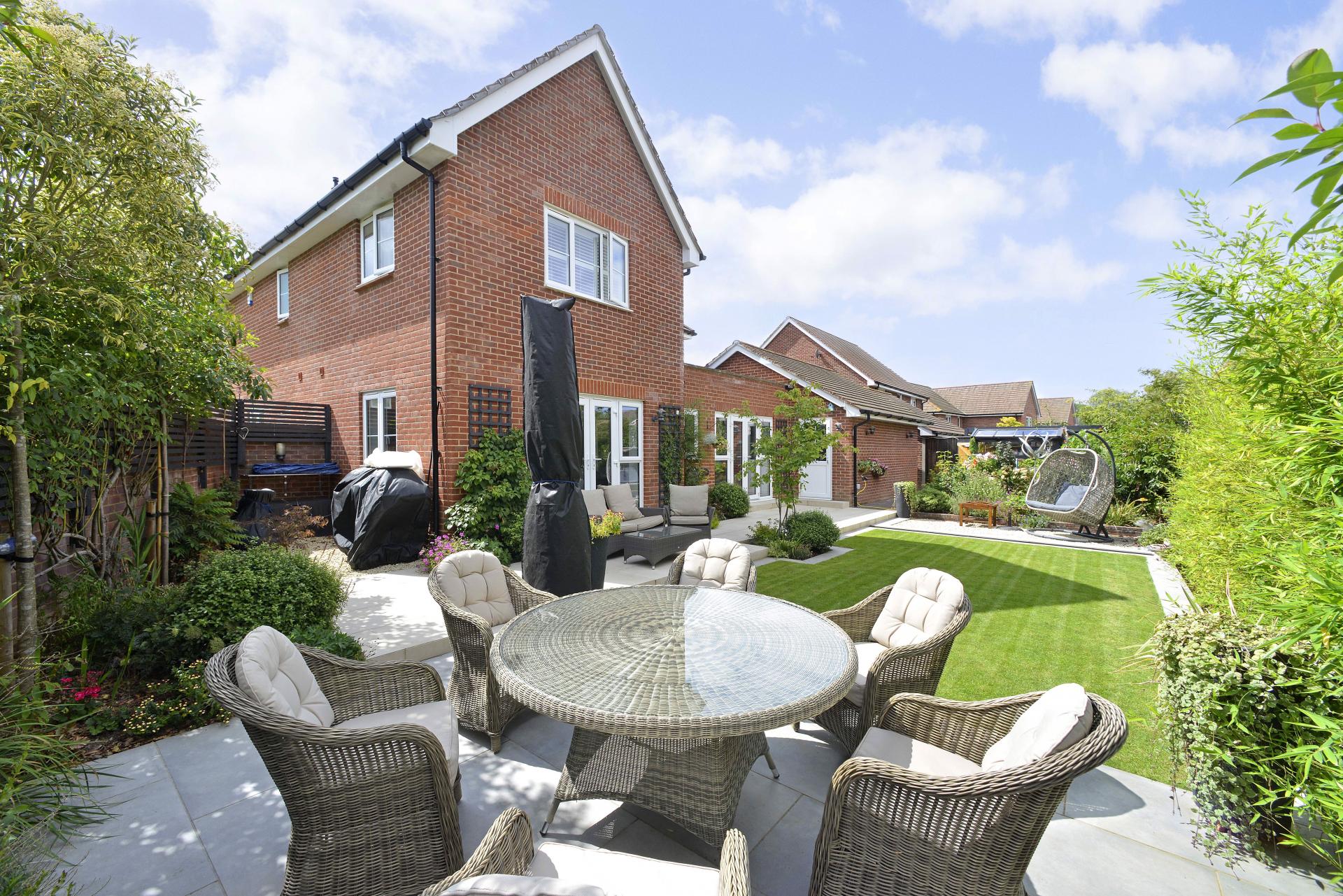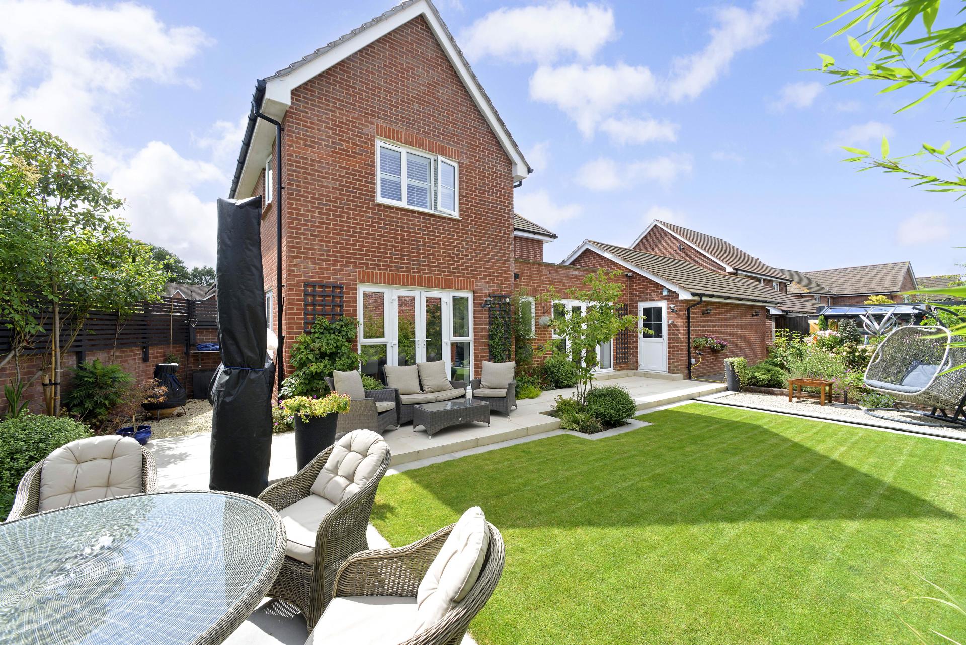 This beautifully presented four-bedroom detached home, built by Crest Nicholson in 2018, has been thoughtfully extended and meticulously maintained, offering a superb arrangement of spacious and versatile accommodation. Upon entry, a welcoming reception hall leads to a cloakroom, a comfortable sitting room with an attractive gas-fired log burner set on a hearth, and a quiet study space. The heart of the home is the well-appointed open-plan kitchen/dining room featuring a central island unit, which flows seamlessly into the newly extended family room—a bright and inviting space overlooking the garden, enhanced by a lantern roof and double doors to the patio. Upstairs, the first floor hosts four generous bedrooms, including a principal bedroom with en-suite bathroom, a guest room with its own en-suite shower room, and a contemporary family bathroom. Stylish window shutters are fitted throughout, with motorised blinds in the kitchen and family areas. Outside, the landscaped gardens offer neatly kept lawns, vibrant flower and shrub borders, and expansive patios perfect for alfresco dining with tranquil water feature. Enclosed mainly by brick walling for privacy, and positioned at the end of the row with no immediate neighbour to one side and open green space adjacent, the setting is both peaceful and private. A viewing is strongly recommended to fully appreciate the quality and elegance of this exceptional home.