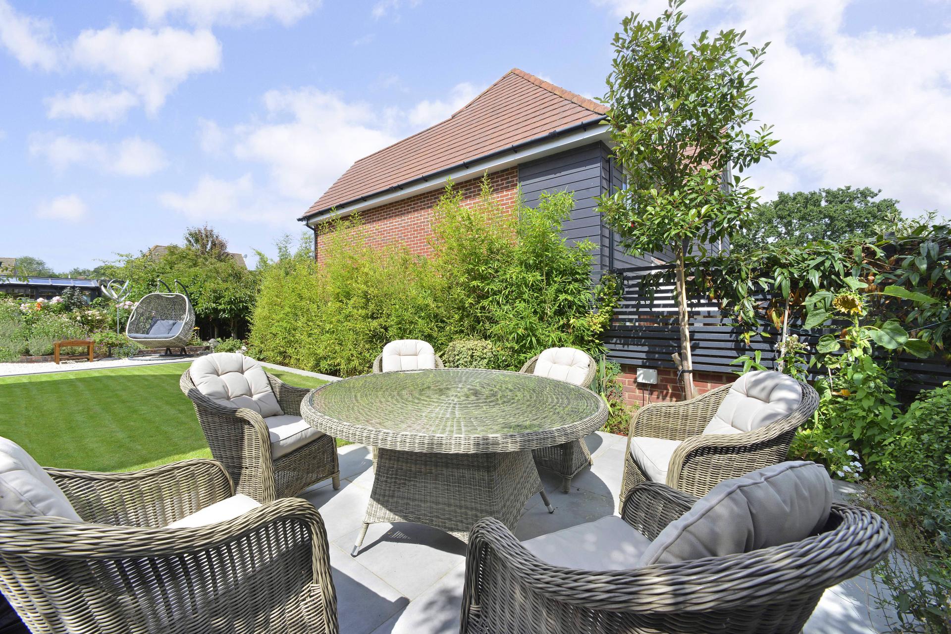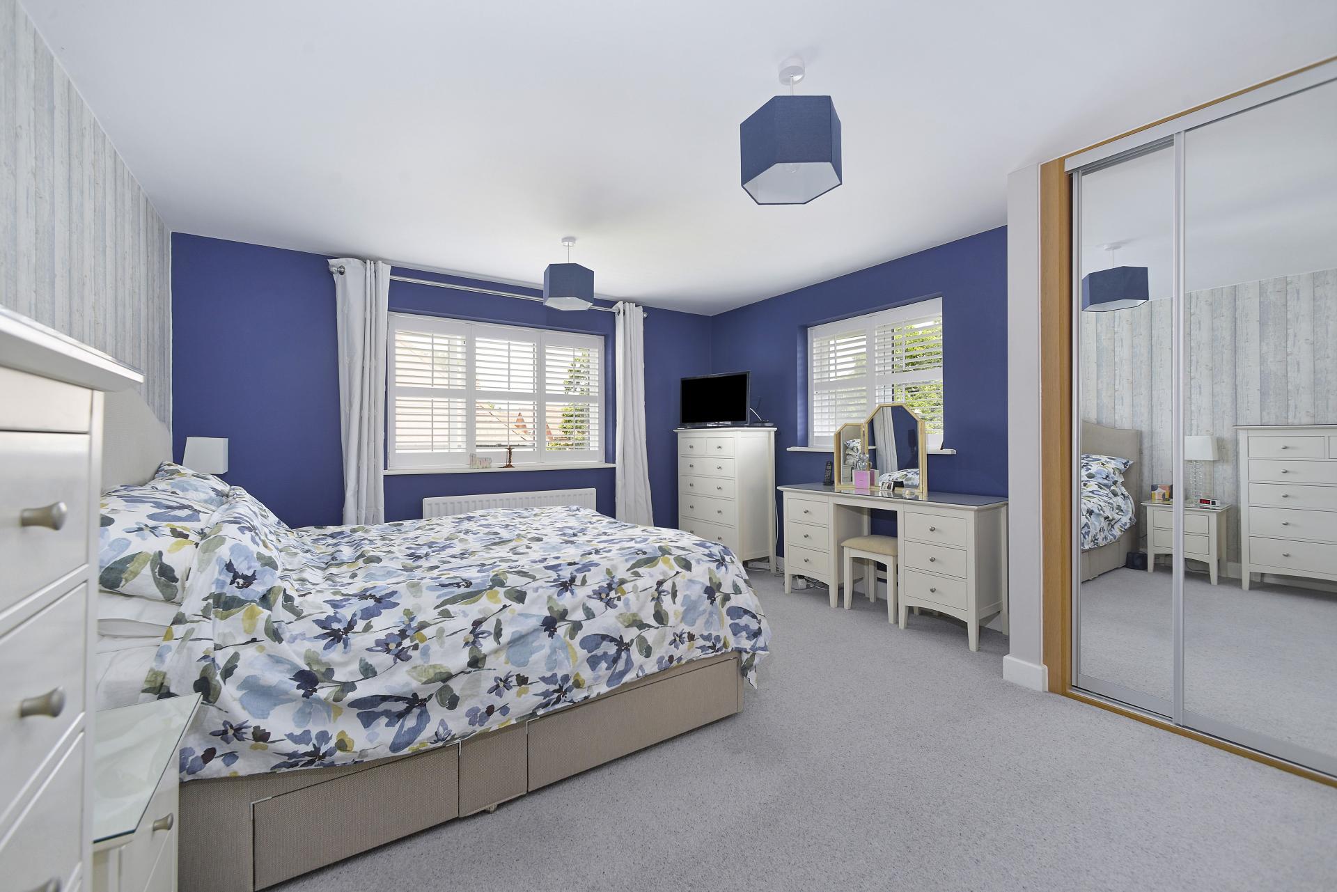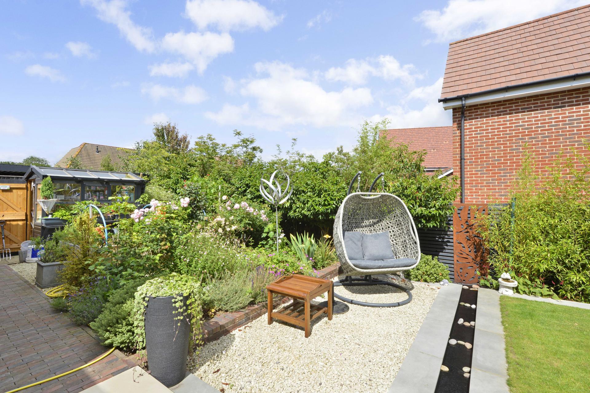 This beautifully presented four-bedroom detached home, built by Crest Nicholson in 2018, has been thoughtfully extended and meticulously maintained, offering a superb arrangement of spacious and versatile accommodation. Upon entry, a welcoming reception hall leads to a cloakroom, a comfortable sitting room with an attractive gas-fired log burner set on a hearth, and a quiet study space. The heart of the home is the well-appointed open-plan kitchen/dining room featuring a central island unit, which flows seamlessly into the newly extended family room—a bright and inviting space overlooking the garden, enhanced by a lantern roof and double doors to the patio. Upstairs, the first floor hosts four generous bedrooms, including a principal bedroom with en-suite bathroom, a guest room with its own en-suite shower room, and a contemporary family bathroom. Stylish window shutters are fitted throughout, with motorised blinds in the kitchen and family areas. Outside, the landscaped gardens offer neatly kept lawns, vibrant flower and shrub borders, and expansive patios perfect for alfresco dining with tranquil water feature. Enclosed mainly by brick walling for privacy, and positioned at the end of the row with no immediate neighbour to one side and open green space adjacent, the setting is both peaceful and private. A viewing is strongly recommended to fully appreciate the quality and elegance of this exceptional home.