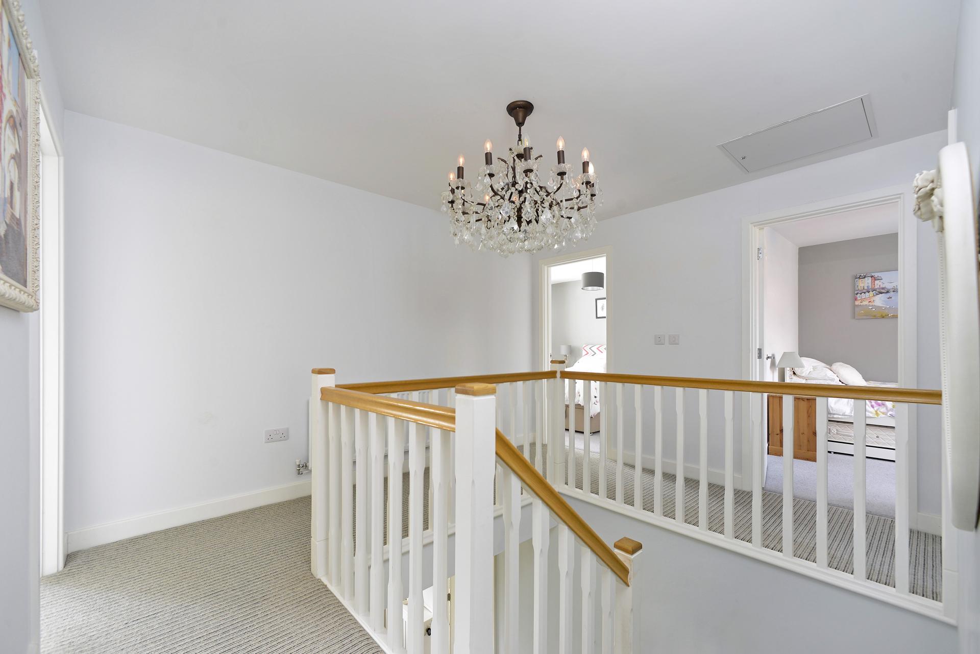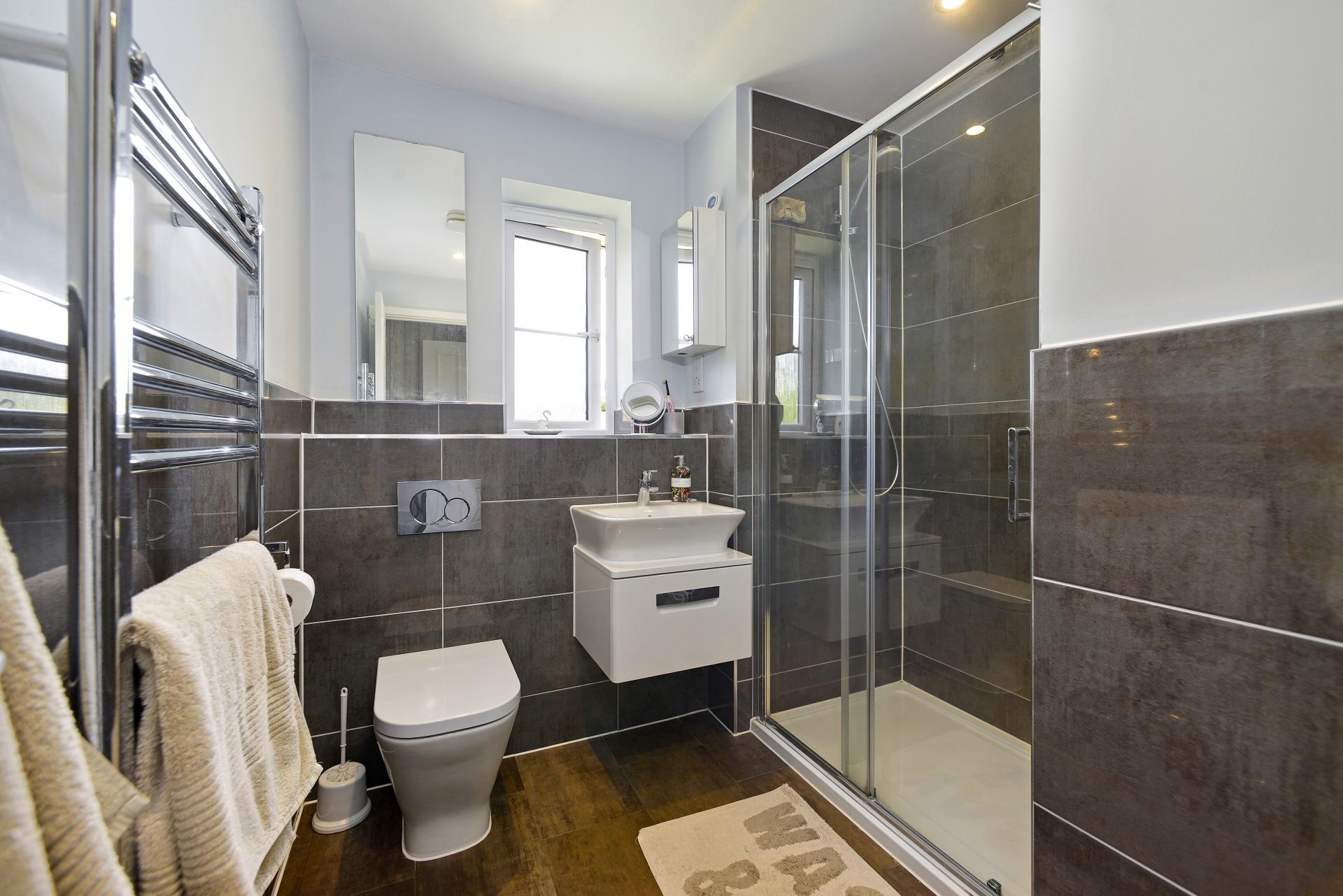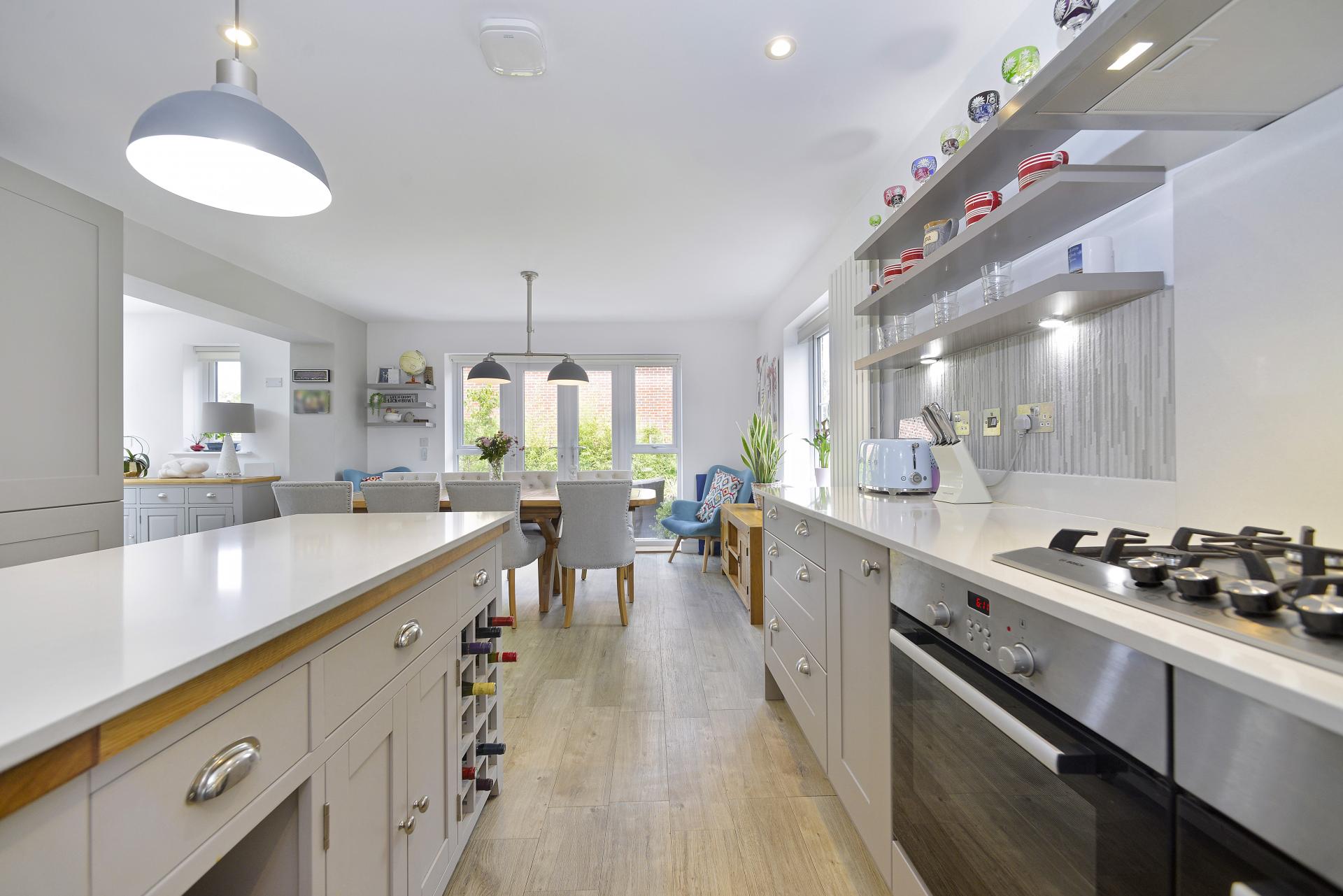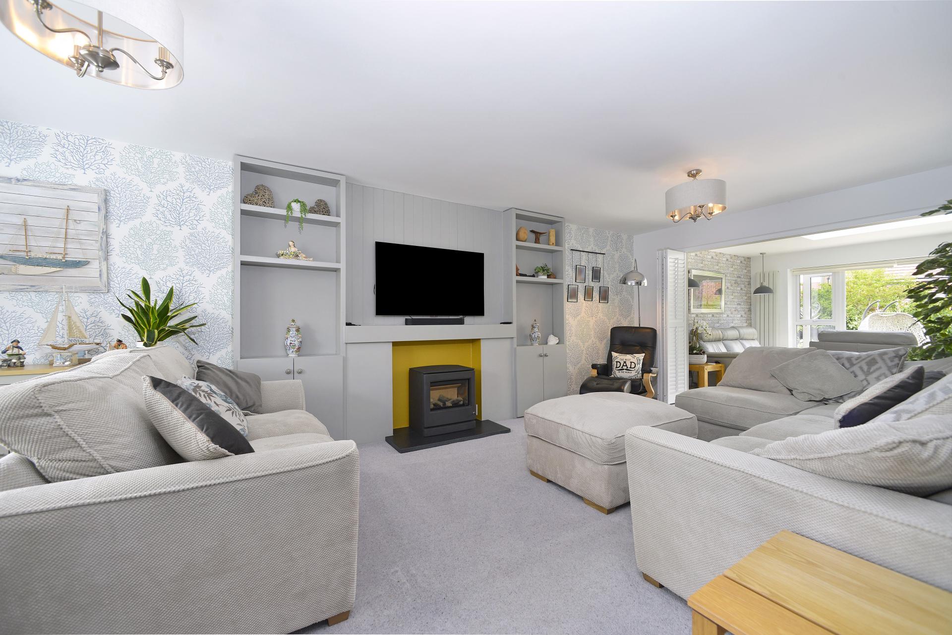 This beautifully presented four-bedroom detached home, built by Crest Nicholson in 2018, has been thoughtfully extended and meticulously maintained, offering a superb arrangement of spacious and versatile accommodation. Upon entry, a welcoming reception hall leads to a cloakroom, a comfortable sitting room with an attractive gas-fired log burner set on a hearth, and a quiet study space. The heart of the home is the well-appointed open-plan kitchen/dining room featuring a central island unit, which flows seamlessly into the newly extended family room—a bright and inviting space overlooking the garden, enhanced by a lantern roof and double doors to the patio. Upstairs, the first floor hosts four generous bedrooms, including a principal bedroom with en-suite bathroom, a guest room with its own en-suite shower room, and a contemporary family bathroom. Stylish window shutters are fitted throughout, with motorised blinds in the kitchen and family areas. Outside, the landscaped gardens offer neatly kept lawns, vibrant flower and shrub borders, and expansive patios perfect for alfresco dining with tranquil water feature. Enclosed mainly by brick walling for privacy, and positioned at the end of the row with no immediate neighbour to one side and open green space adjacent, the setting is both peaceful and private. A viewing is strongly recommended to fully appreciate the quality and elegance of this exceptional home.