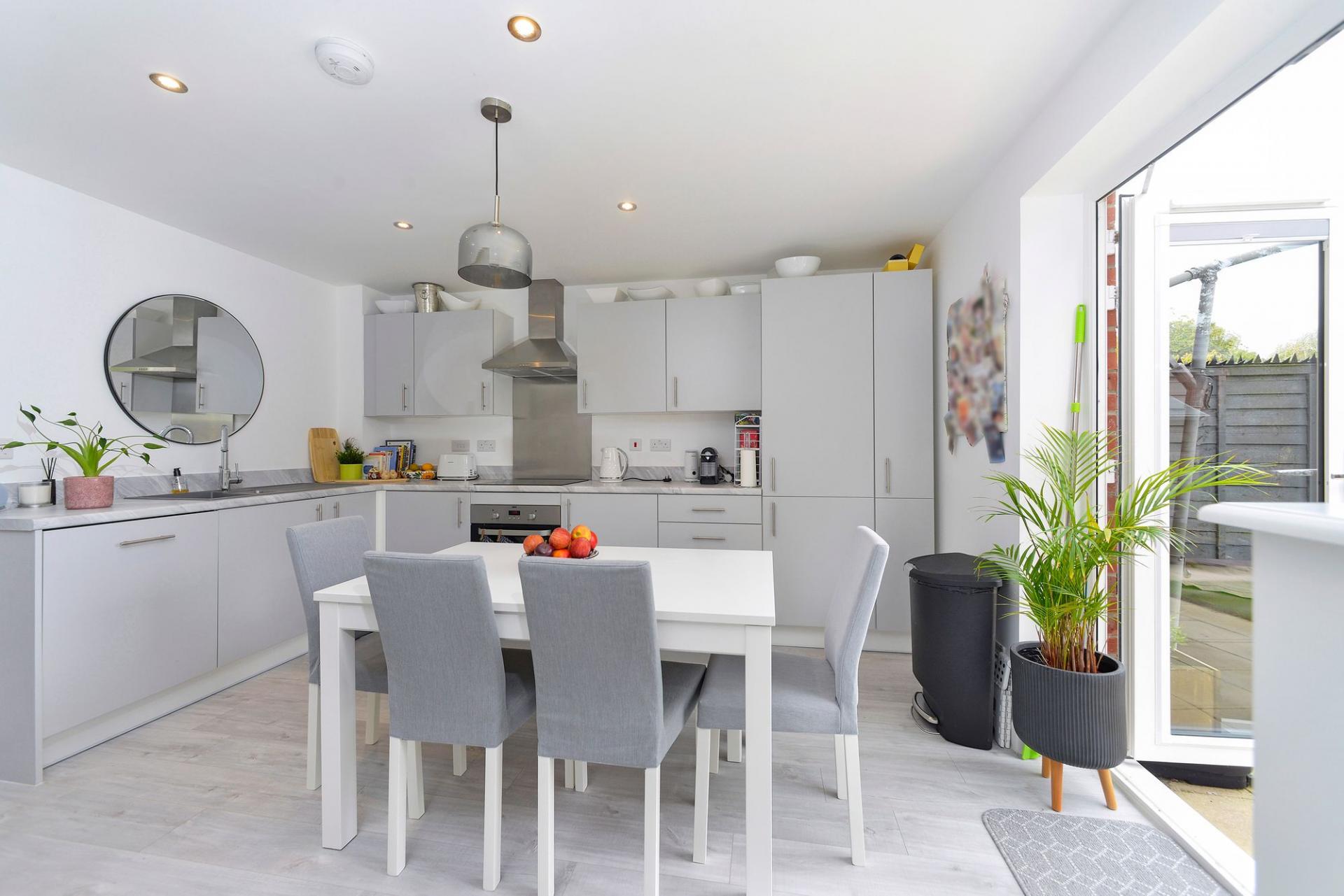 Completed in 2022, the property spans two thoughtfully designed floors, combining style, comfort, and practicality throughout. The ground floor opens with a welcoming sitting room, complete with a deep understairs cupboard for storage. This leads into a sleek kitchen/breakfast room featuring integrated appliances and double doors to the garden, ideal for entertaining or relaxed everyday living. A separate utility room and a ground floor cloakroom add further convenience.