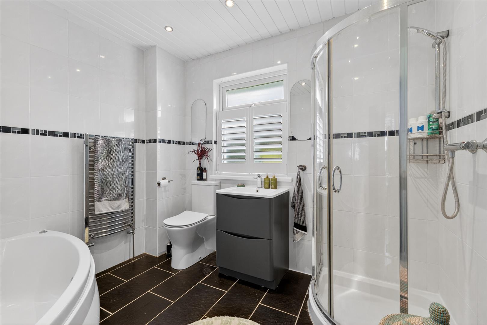 Bathroom - 2.79m x 2.41m (9'2 x 7'11) - White suite comprising of low flush WC, wall hung wash hand basin, chrome mixer tap, vanity storage below, panelled bath with mixer taps, telephone handle attachment, Jacuzzi bath fittings, walk-in thermostatically controlled shower, telephone handle attachment, sliding glazed shower screen, tiled walls, tiled floor, chrome heated towel rail, uPVC tongue and groove ceiling, inset spotlights, extractor fan.