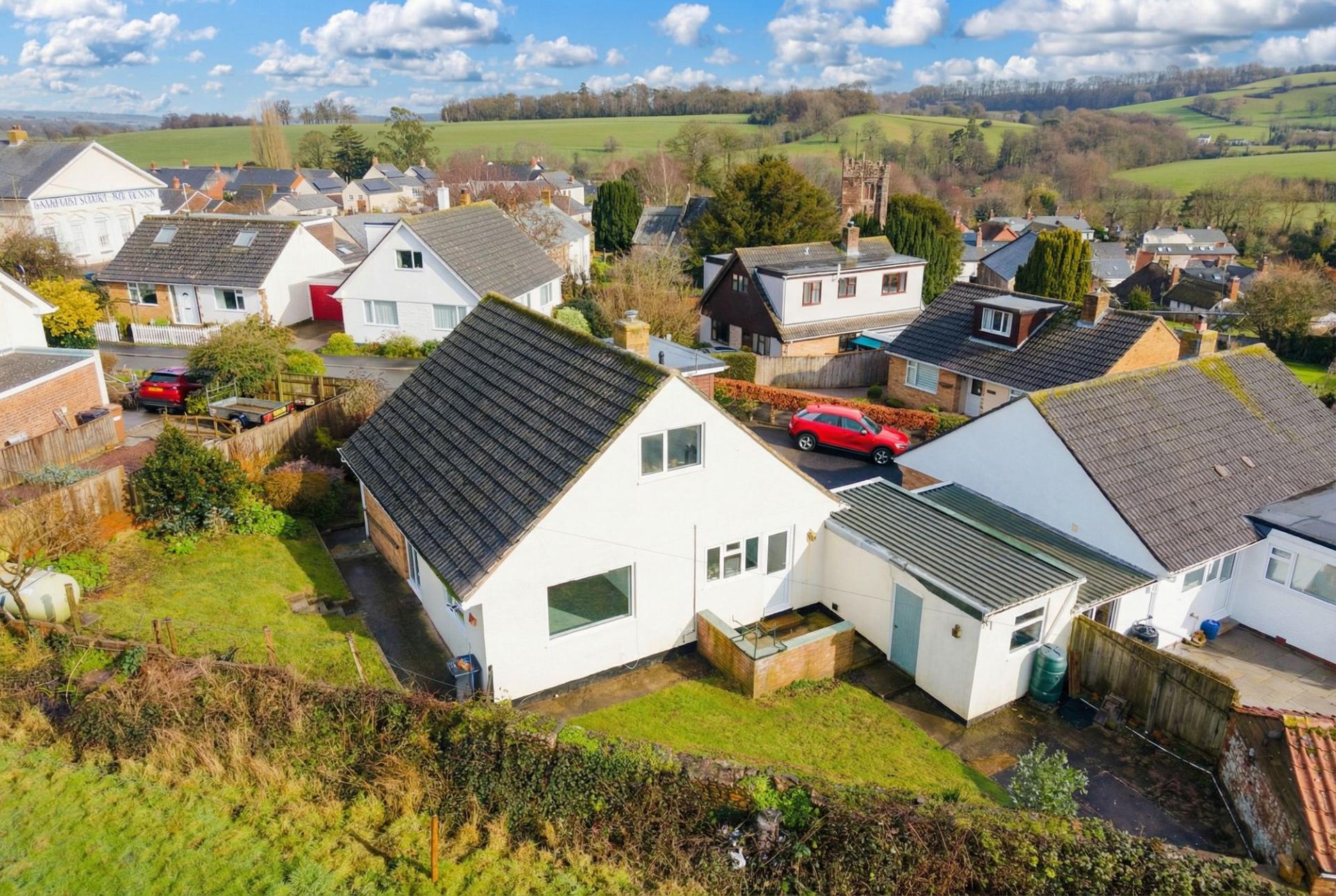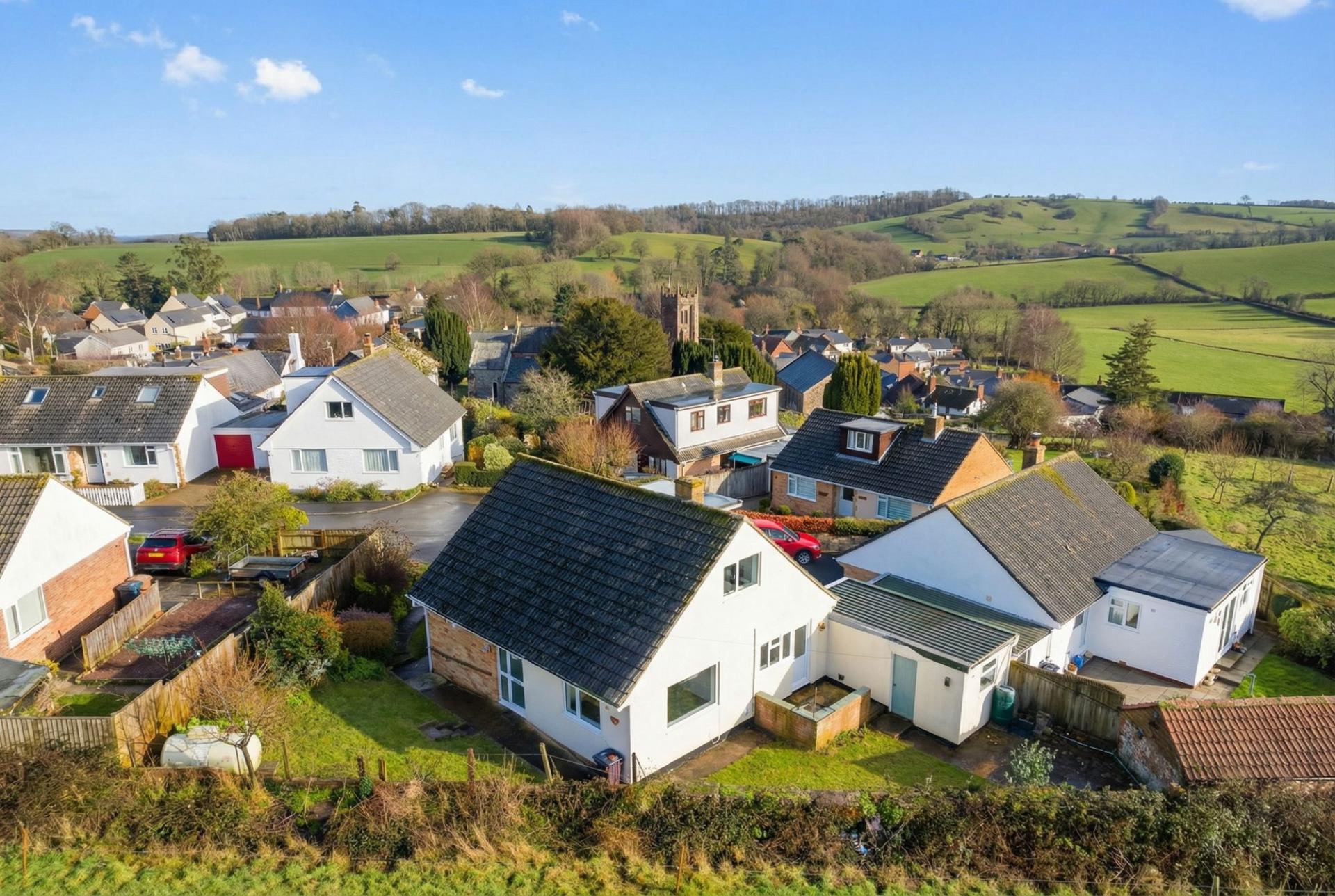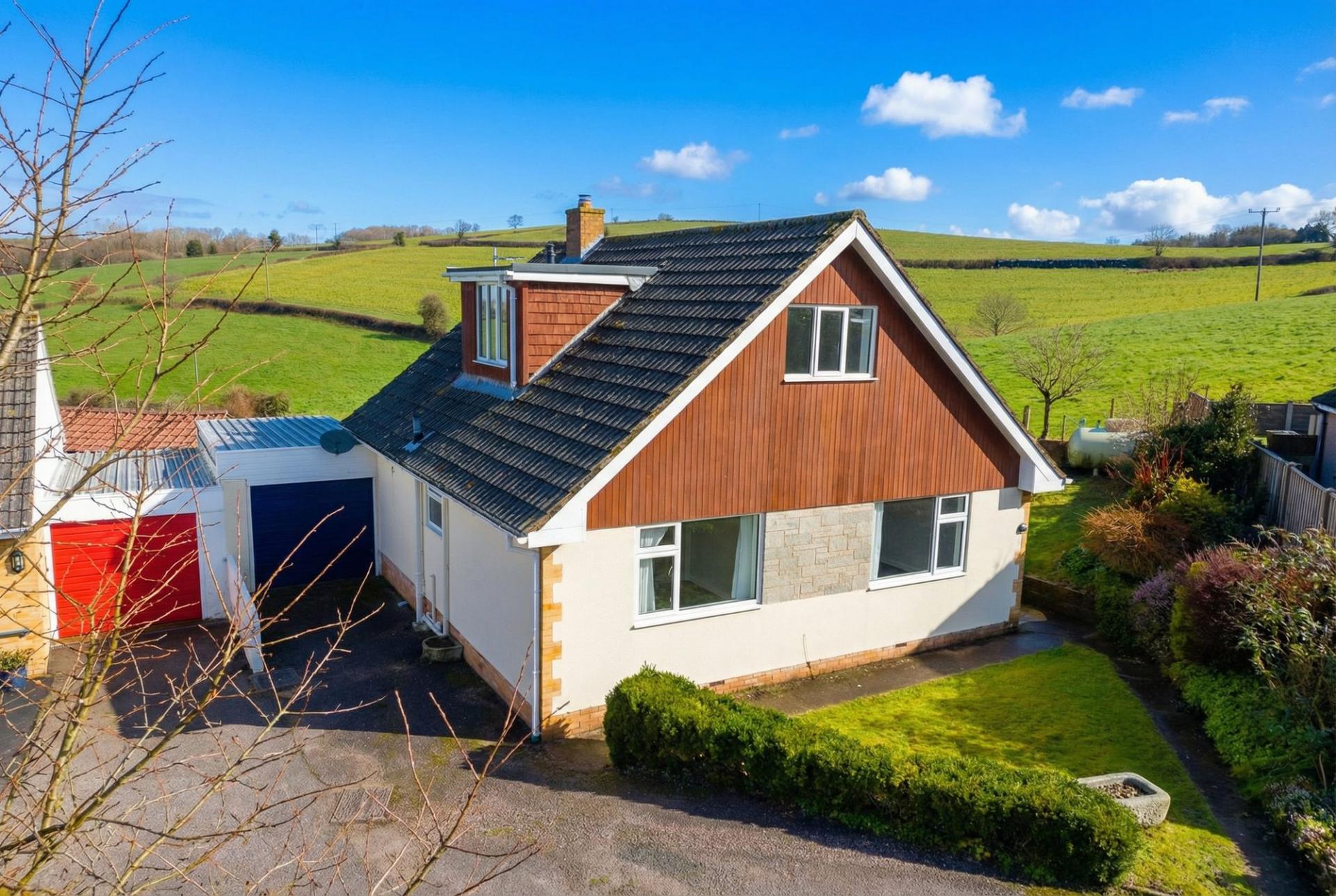 A 1930’s detached, village edge bungalow with views, plenty of parking and even a large garage suitable for a motorhome!