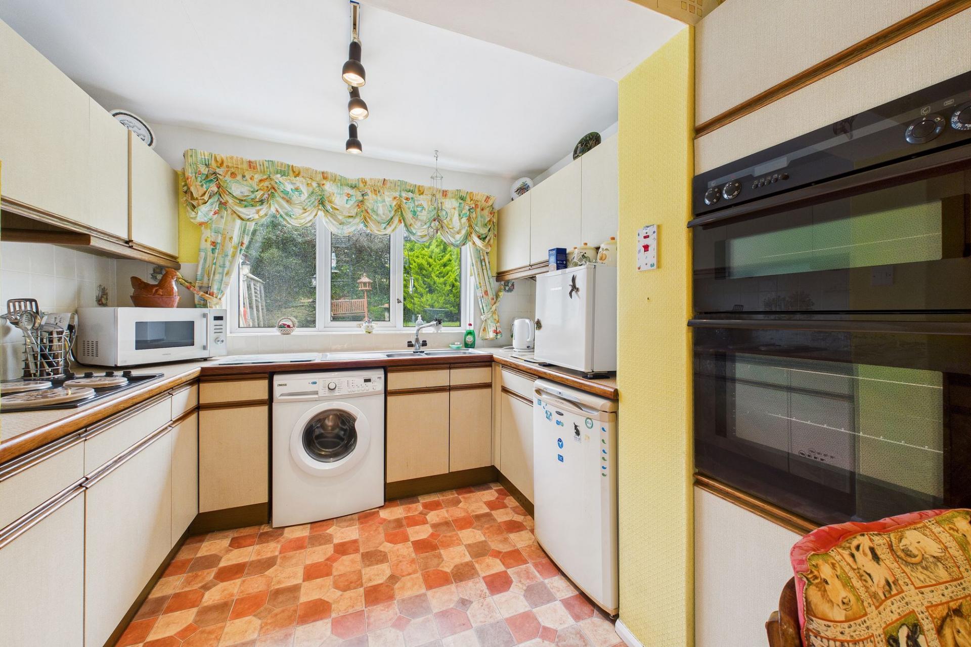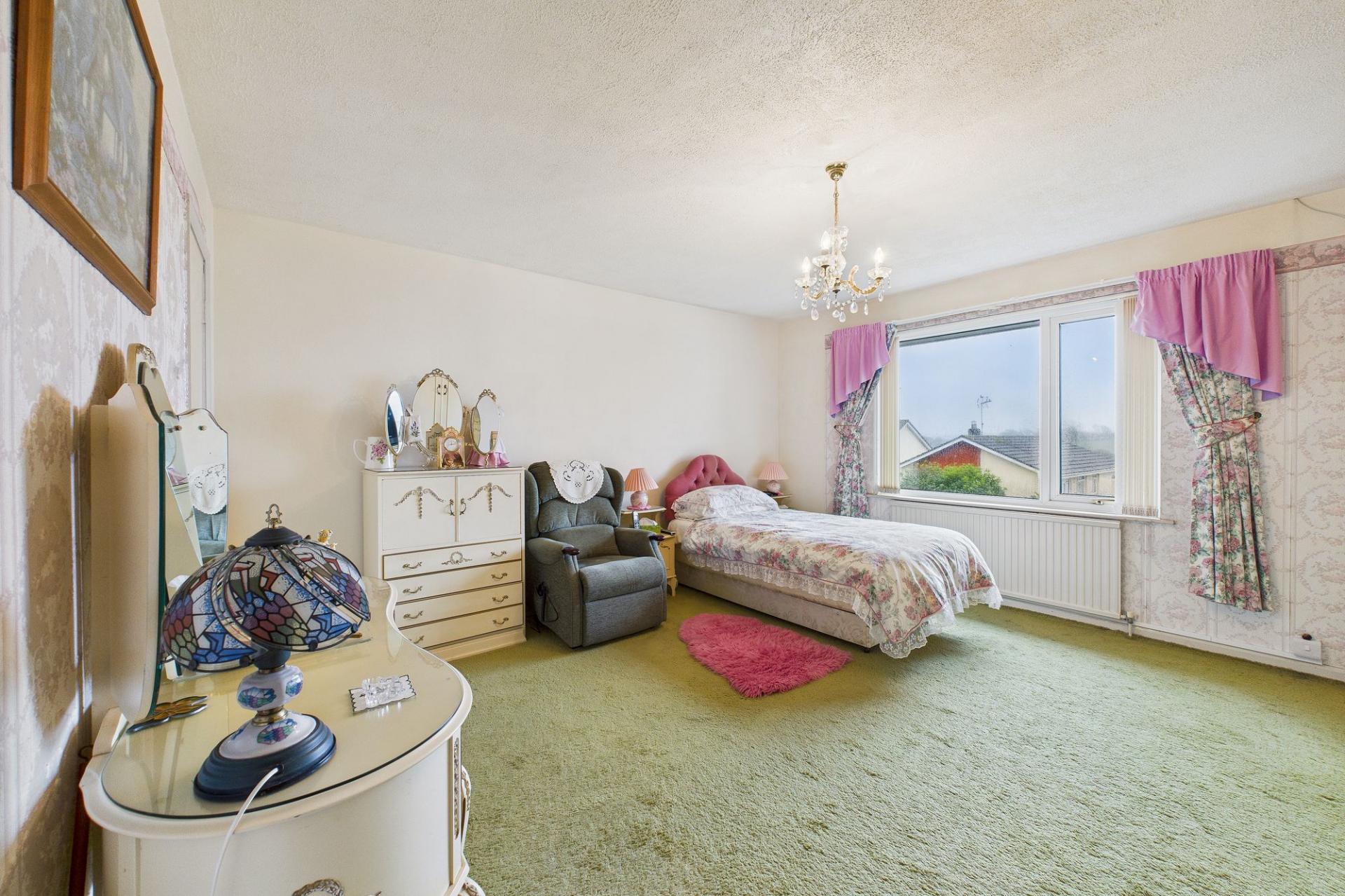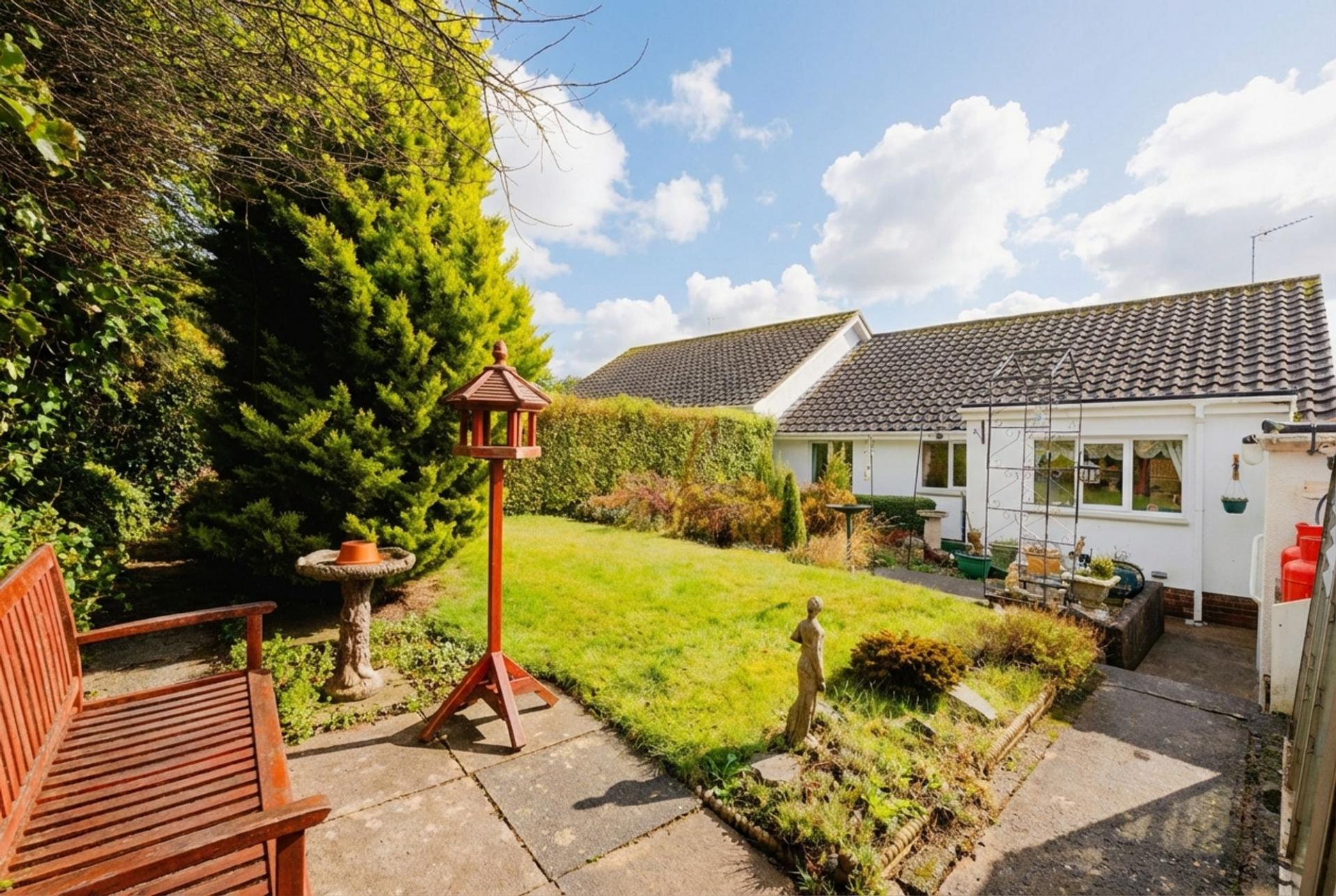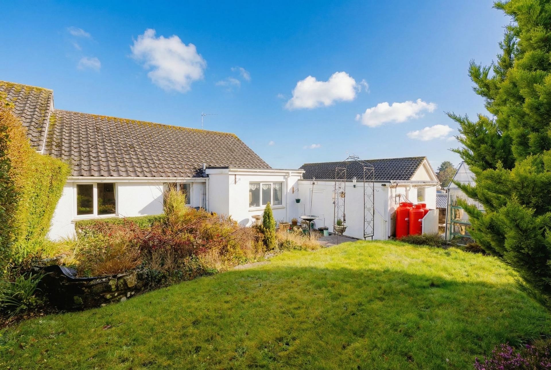 This detached bungalow occupies an elevated cul-de-sac position in the village with far reaching views over the rooftops and countryside to Dartmoor on the horizon on a clear day. Built in the 1970’s, the property has been enlarged since then with the additions of a kitchen extension at the rear, a dual entrance porch to the side and the garage was also widened to give some extra space. It’s complete with uPVC double glazing, LPG central heating (gas bottles delivered and connected on a contract so acts like a usual gas supply) and although it's a little dated in décor, the room sizes are generous for a property of this type. The large living room is south facing and takes in those views at the front, whilst the extended kitchen/dining room enjoys a view of the rear garden. There are two double bedrooms, both with built in storage and the bathroom has been upgraded to a shower room. The loft has electric, lighting and is partly boarded.