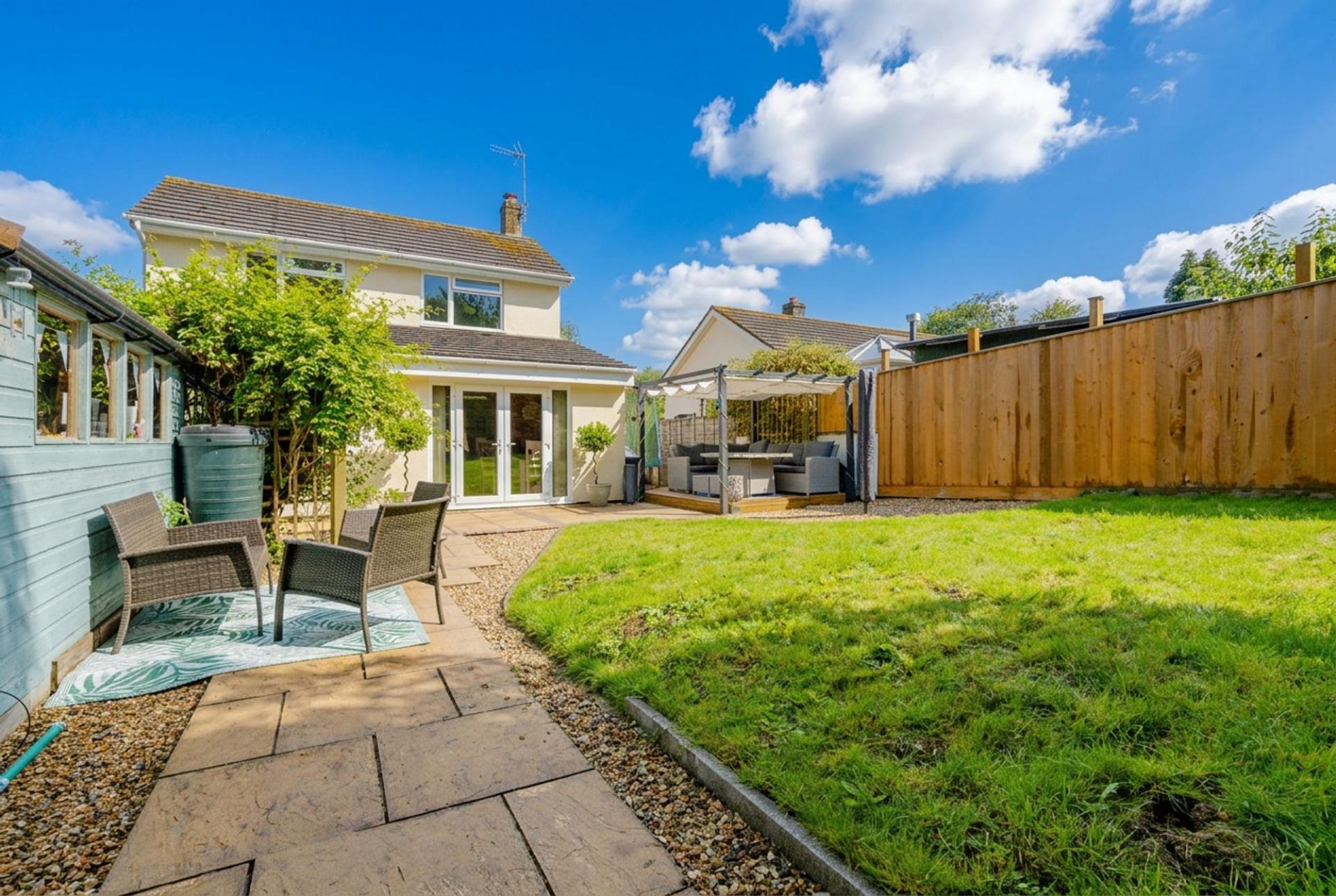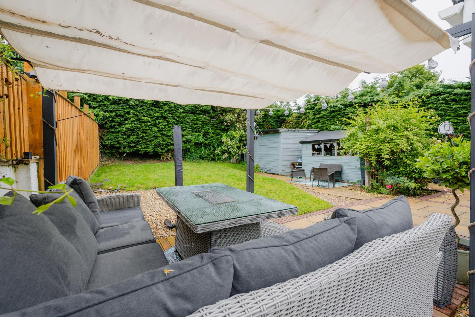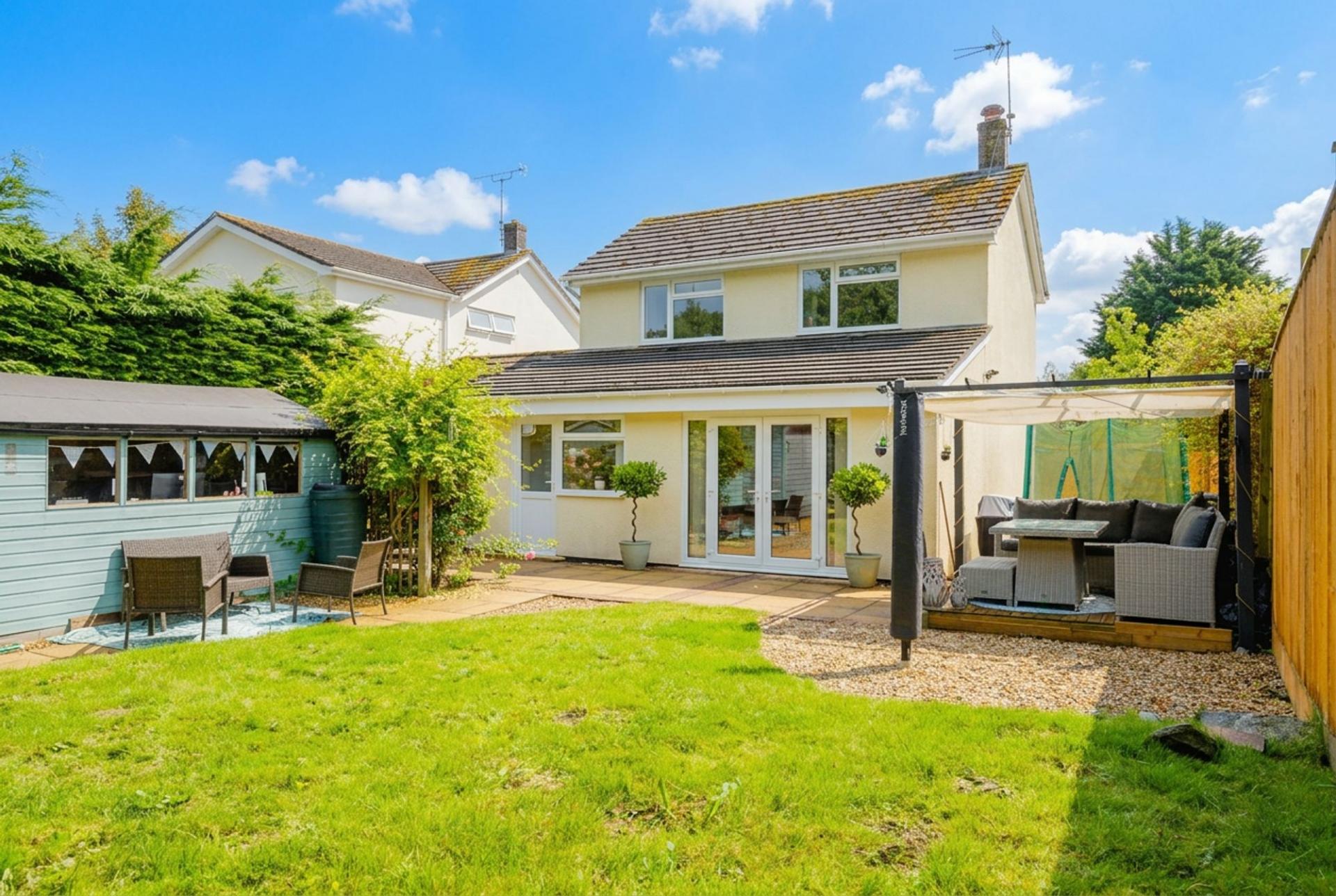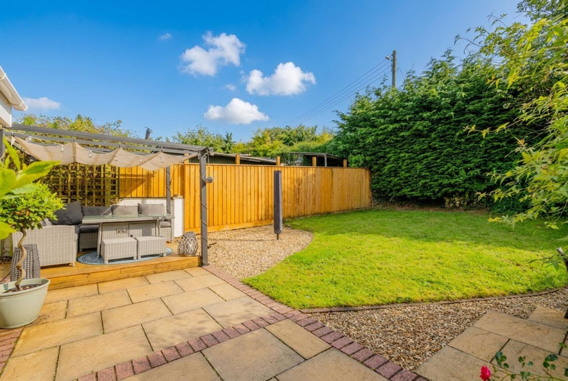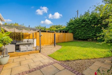 To the front of the property there is parking for 4 vehicles and a single garage along with an open lawned area with shrub borders. To the side is a large open space suitable for extending the house (STP) or for caravan/boat storage. The rear garden is laid to lawn with a patio and decking area with an attractive pergola with retractable shelter. There are two large sheds, one for garden/tool storage and the other has been insulated and suitable for home office or playroom. Both sheds and garage have an electrical supply.