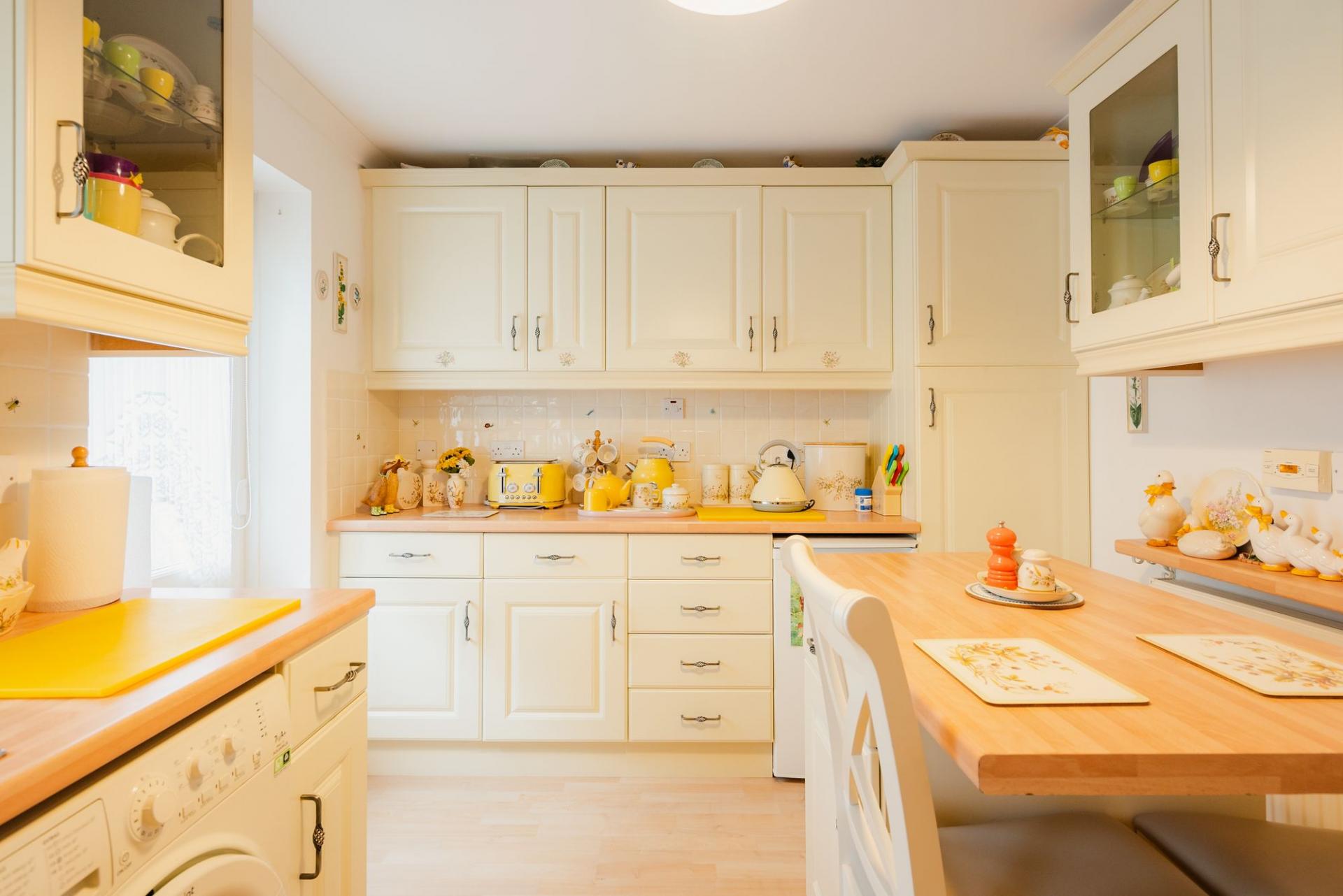 The south facing lounge/diner has a large deep bay window giving plenty of light into this spacious room that could be used as one lounge or separately as a lounge/diner. There is a marble fireplace with feature fire. The kitchen has cream units with double eye level oven and 4 ring ceramic hob. There is space for a washing machine and fridge and a central island has a breakfast bar seating arrangement. A door leads from the kitchen to the side of the property.