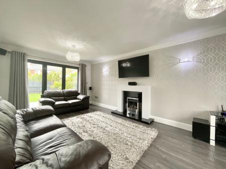 - Stunning dual-aspect living room with bay window, bifold doors to the garden, and a feature fireplace creating a bright yet cosy atmosphere.