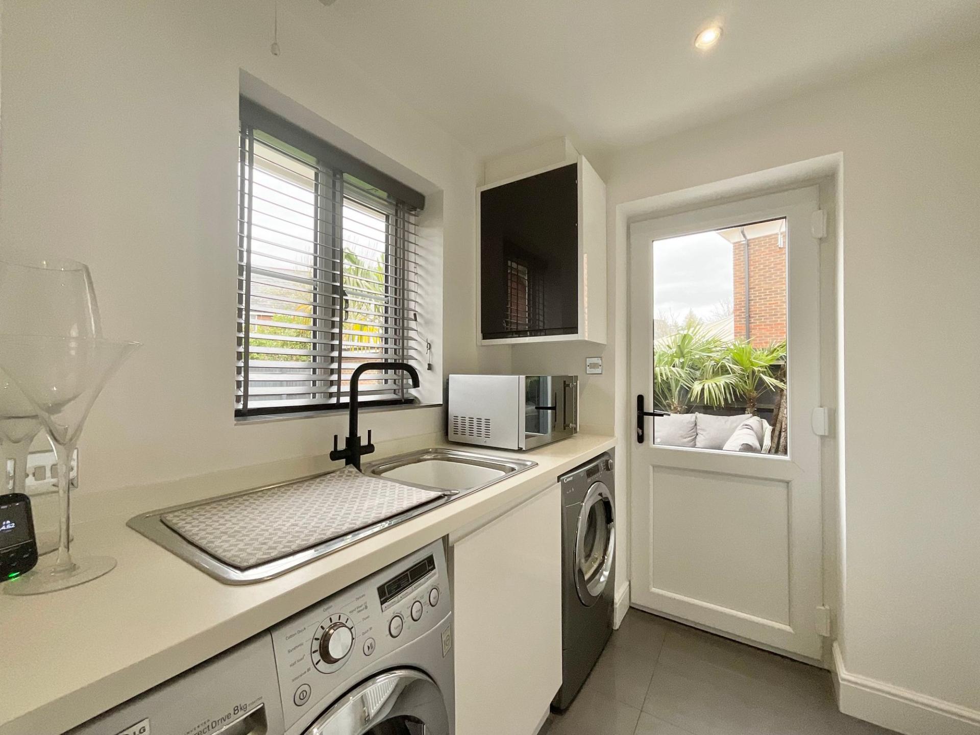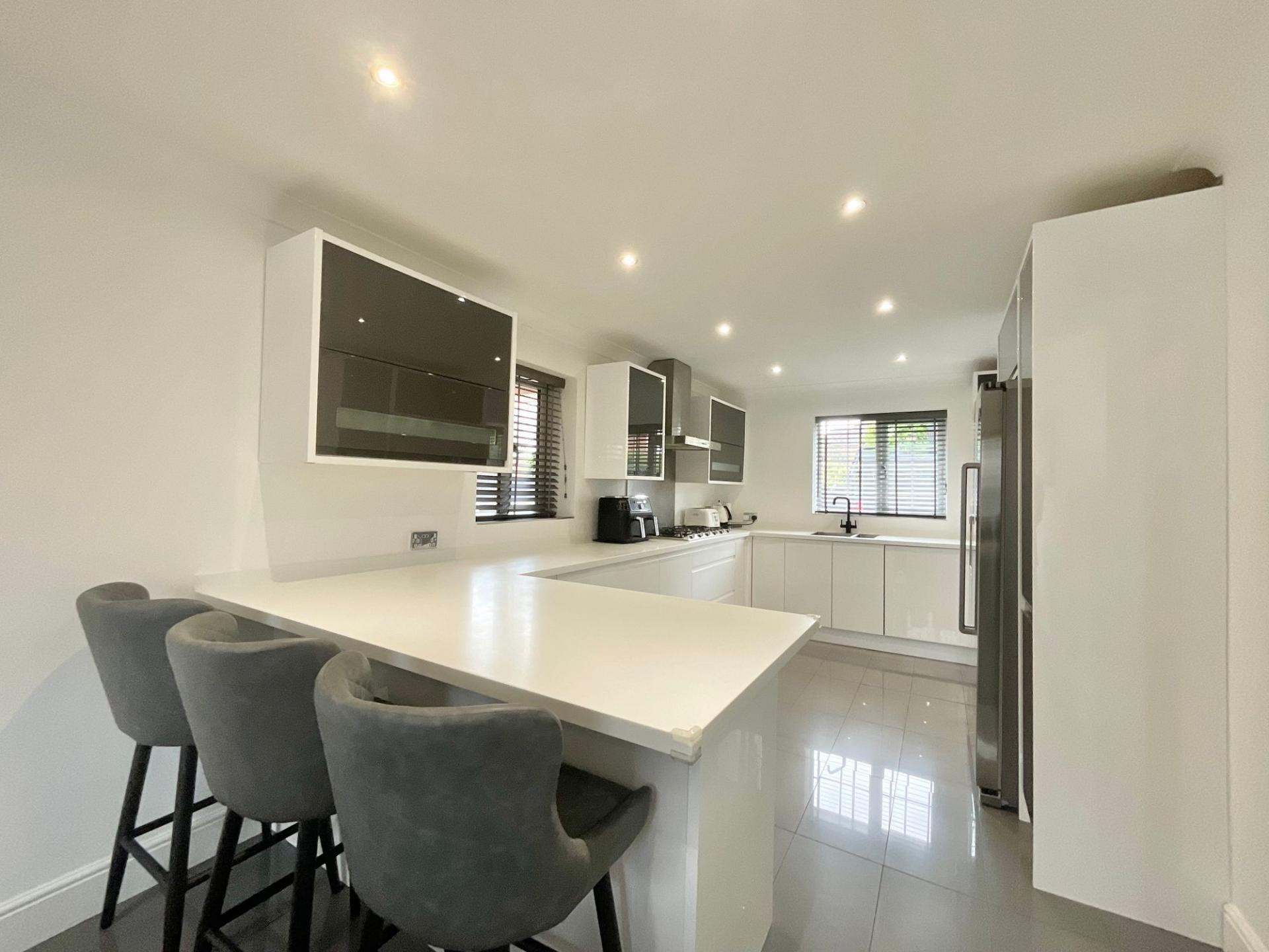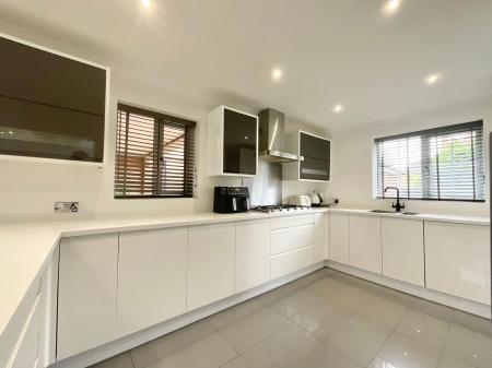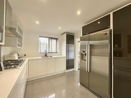 - Contemporary kitchen with dining space and breakfast bar, complete with integrated wine fridge, gas hob, dishwasher, and separate utility room.