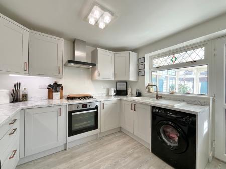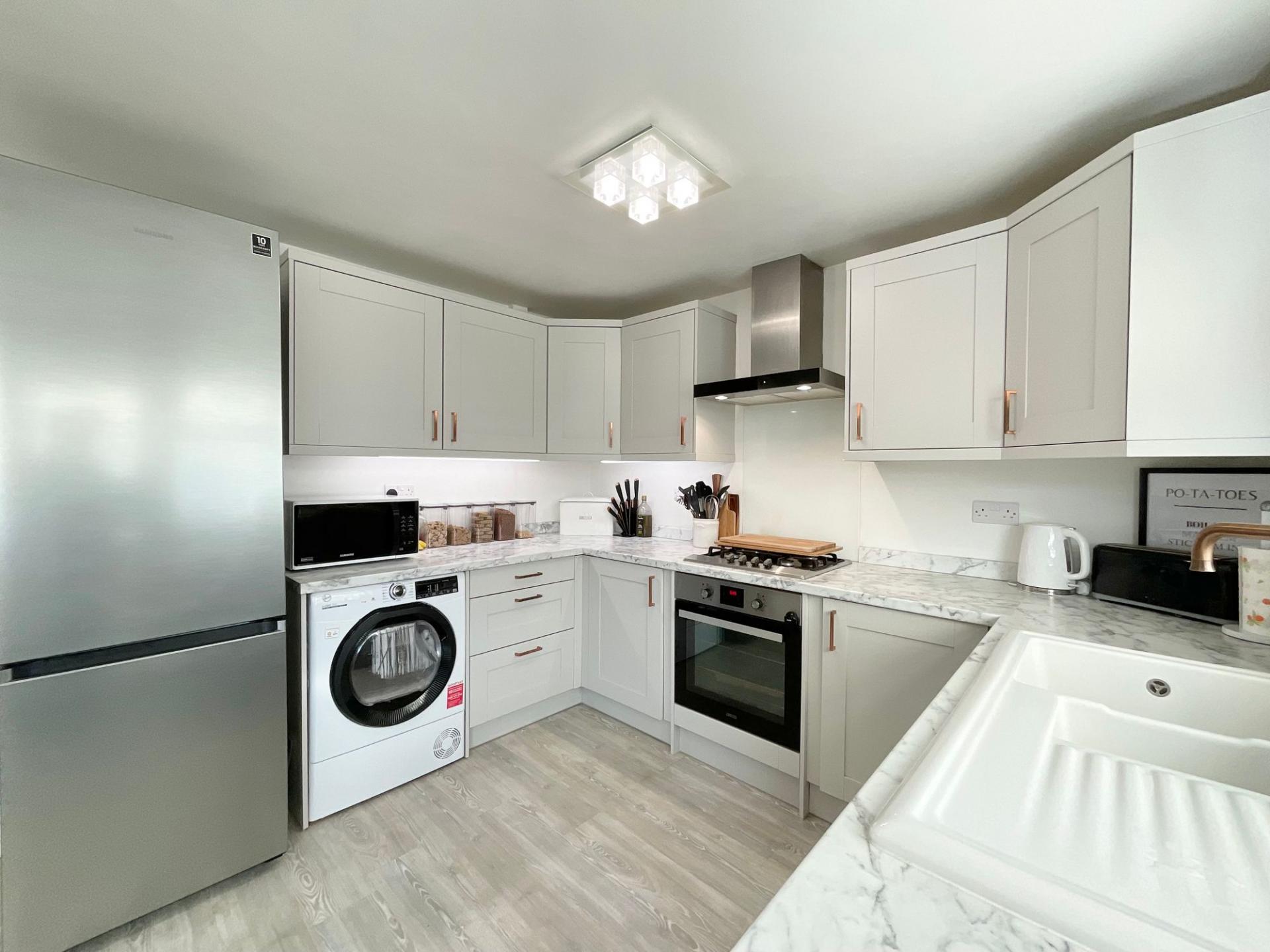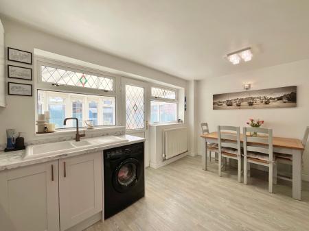 - Spacious kitchen/diner with integrated oven, gas hob, appliance space, and handy under-stairs storage cupboard.