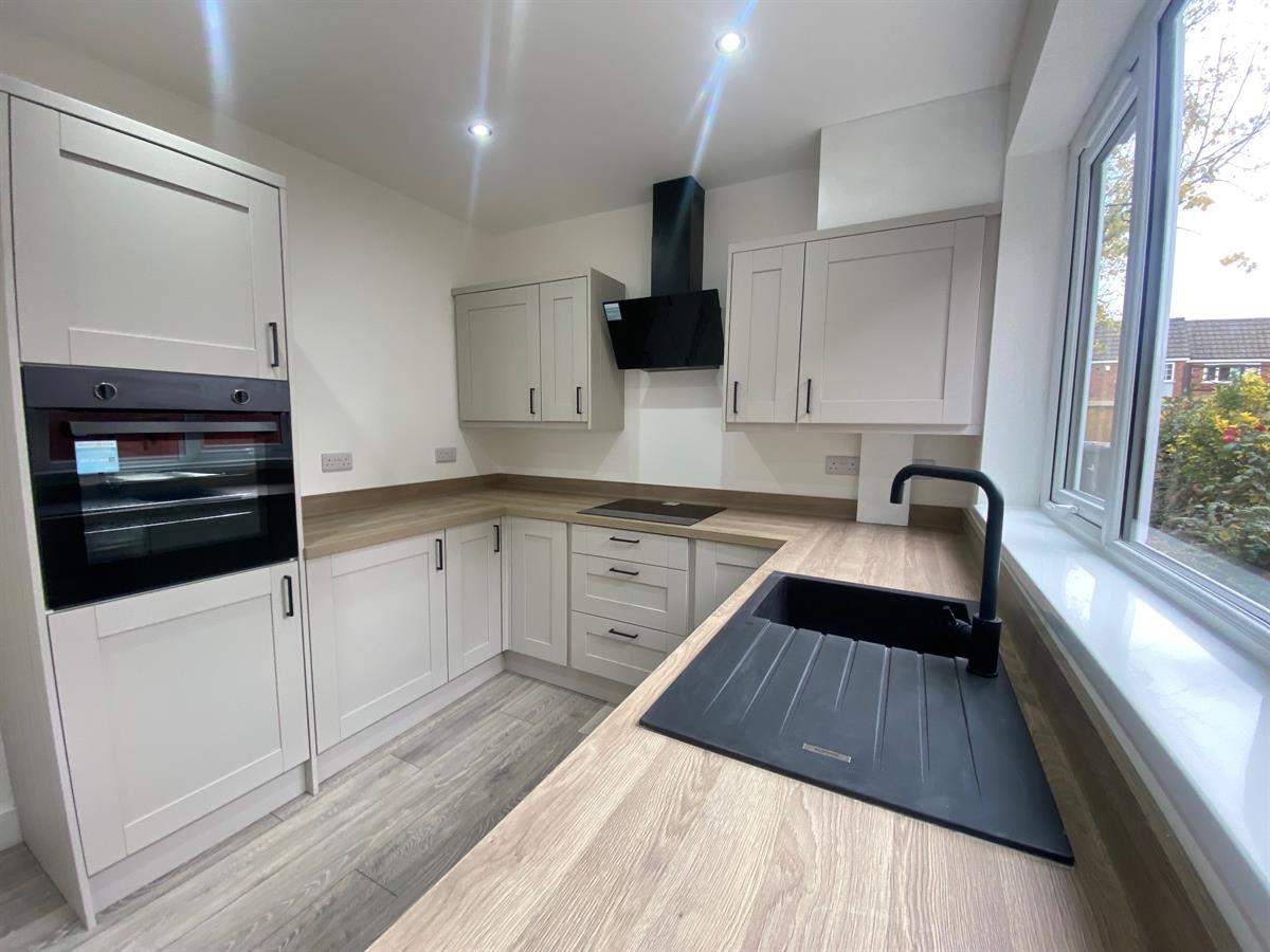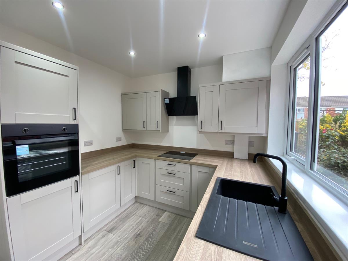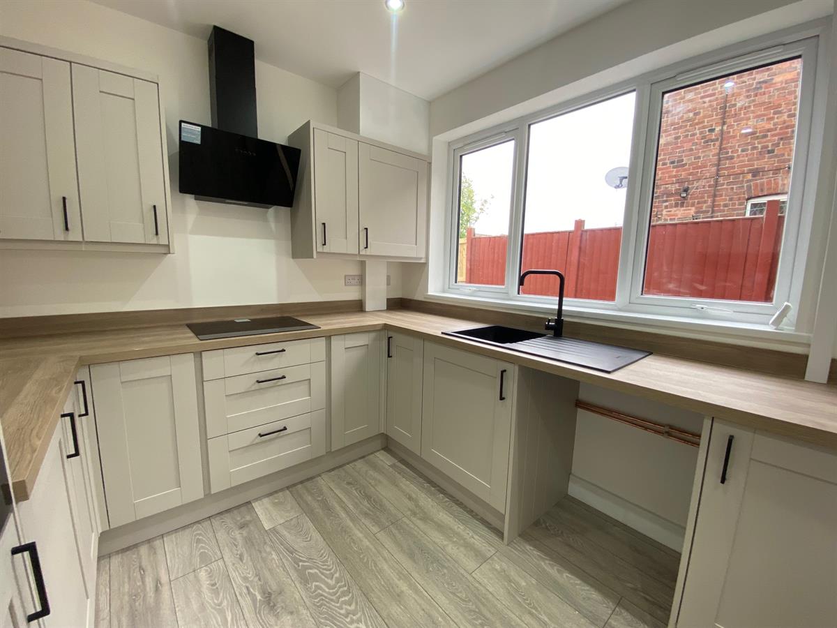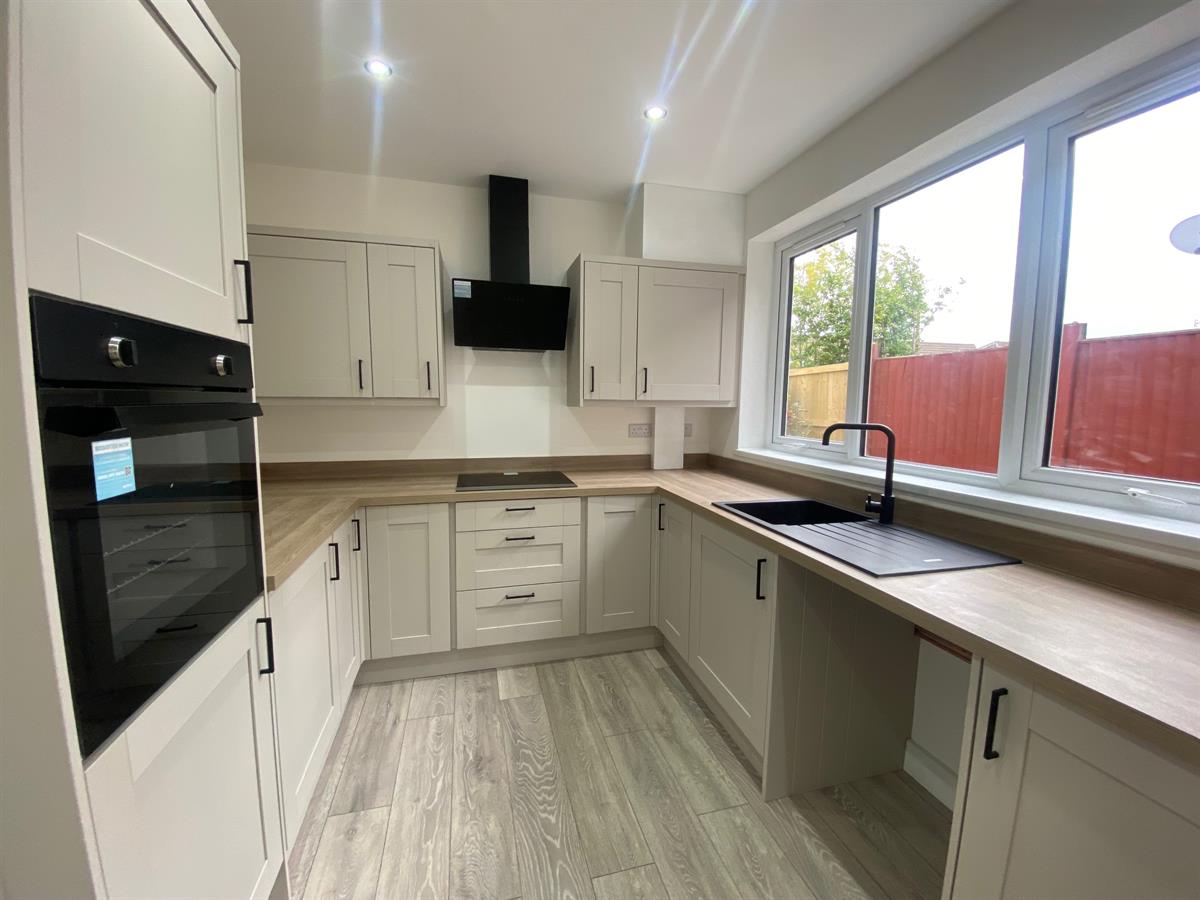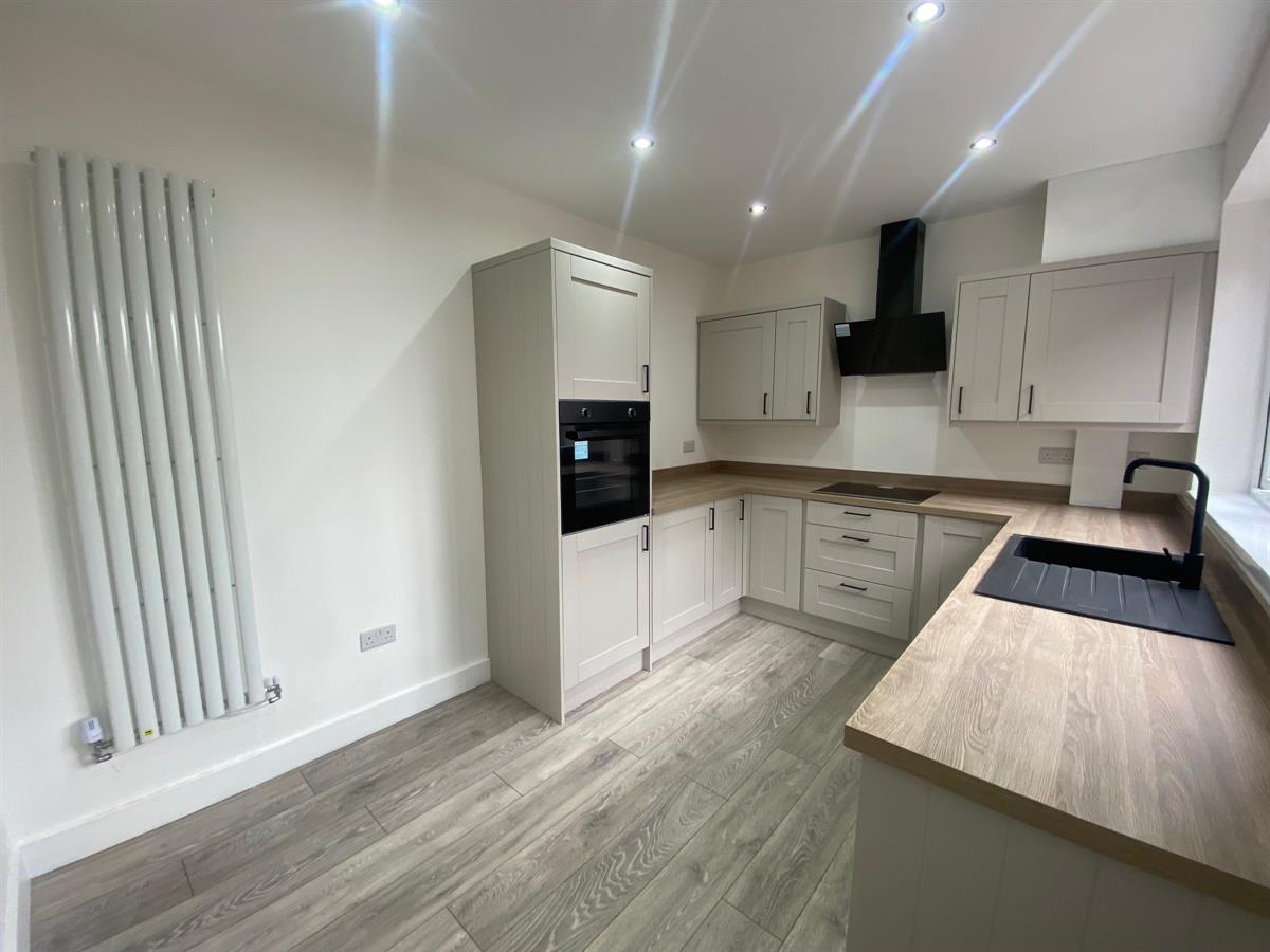 Newley fitted Wren kitchen in a stunning soft mushroom, matte finish with work surface over incorporating a sink and drainer with mixer tap over. Integrated eye level electric fan oven, hob with extractor over, space for washing machine, space for fridge / freezer, complimentary tiling. Part glazed, composite door to side and uPvc double glazed window to side elevation. Wall mounted flat panel radiator.
