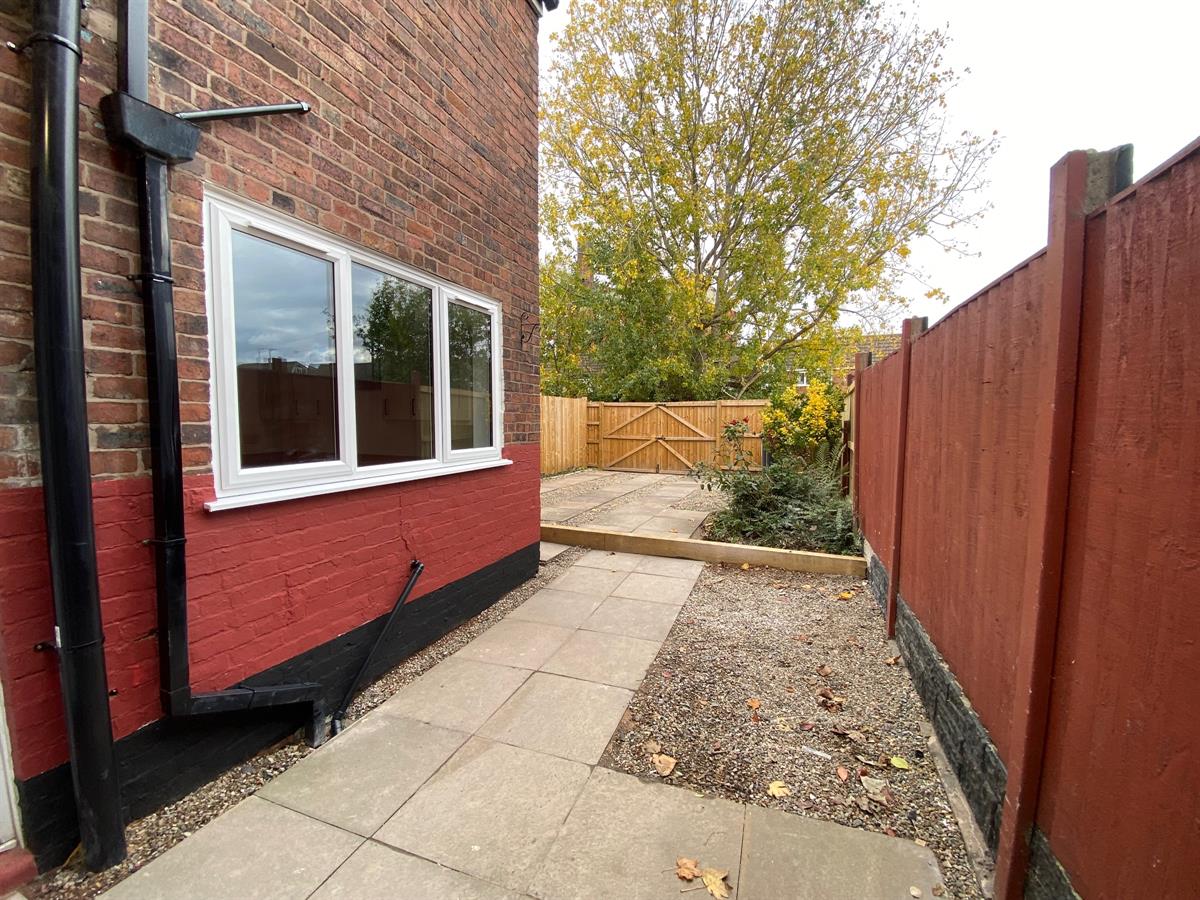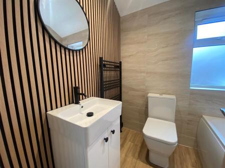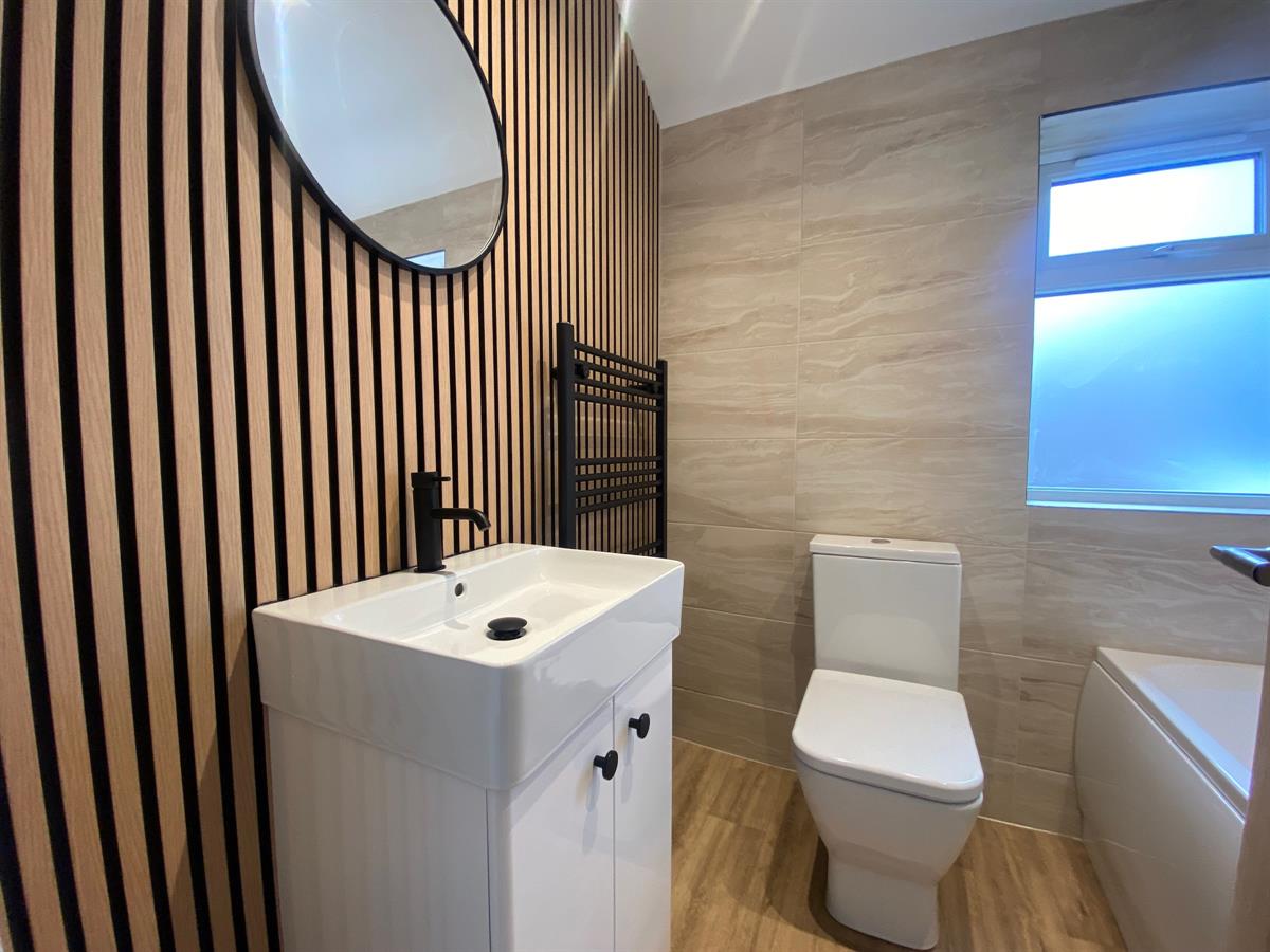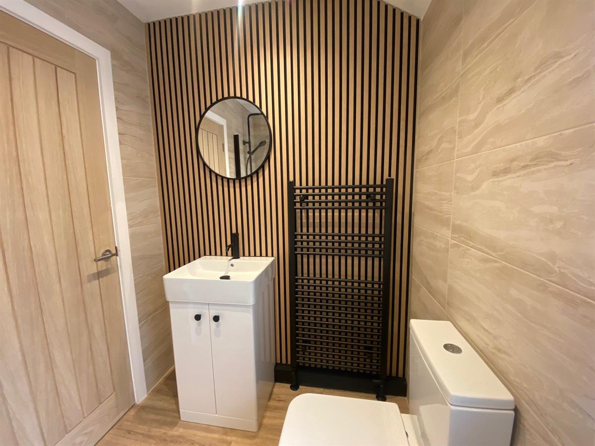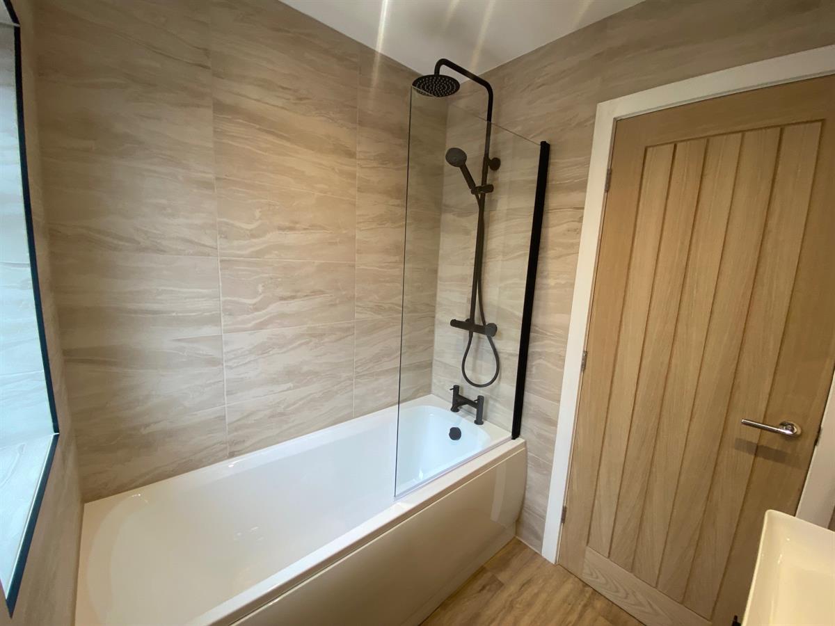 Newley fitted Wren kitchen in a stunning soft mushroom, matte finish with work surface over incorporating a sink and drainer with mixer tap over. Integrated eye level electric fan oven, hob with extractor over, space for washing machine, space for fridge / freezer, complimentary tiling. Part glazed, composite door to side and uPvc double glazed window to side elevation. Wall mounted flat panel radiator.