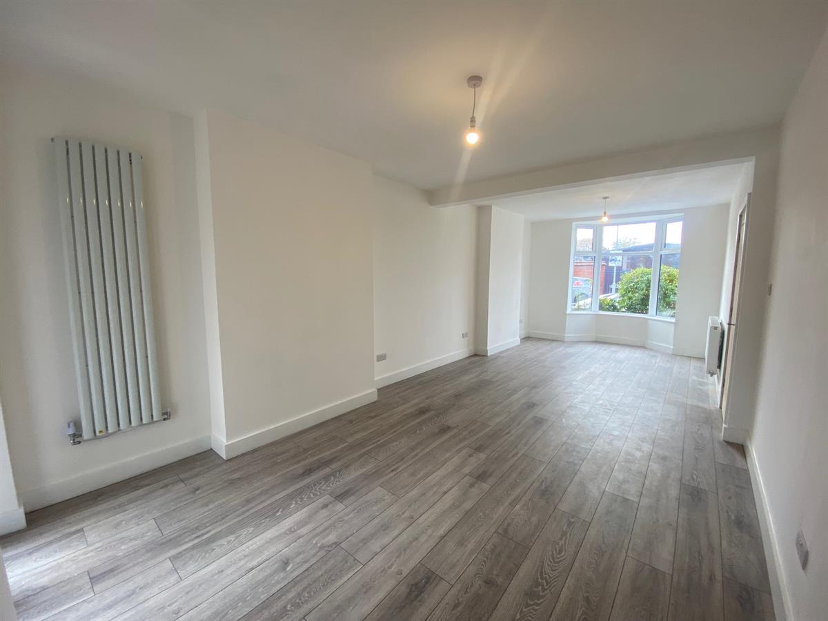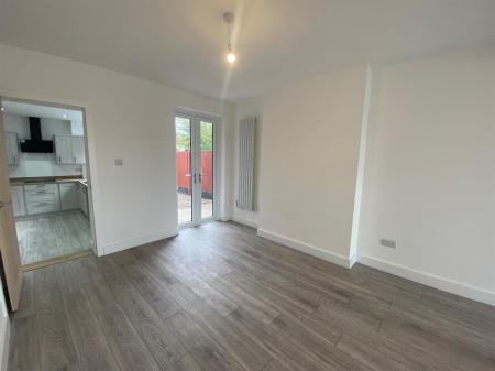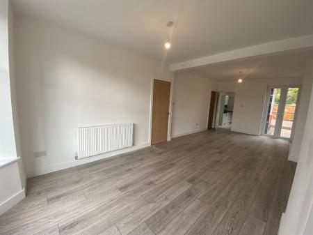 Spacious and light living /dining room with laminate flooring continued through from the reception hall. Modern, wall mounted flat panel radiator. Walk in uPvc double glazed bay window to front elevation and uPvc double glazed French doors leading out to the rear patio. Door through to: