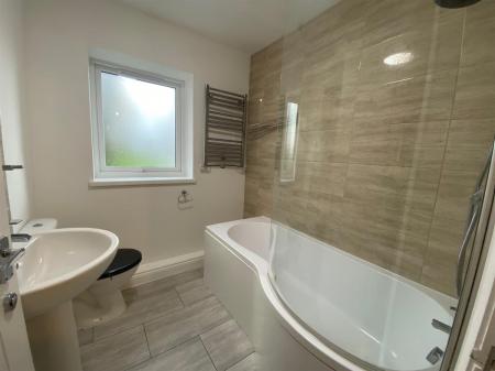Fitted with a 3 piece suite comprising 'P' shaped, panelled bath with shower and mixer tap over and glazed shower screen, low level push button W.C., pedestal wash hand basin with mixer tap over and tiled splashback. Part tiled walls. Wall mounted chrome ladder towel rail. Extractor fan and tiled flooring.