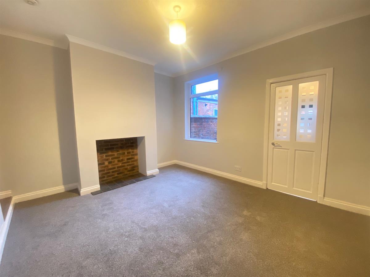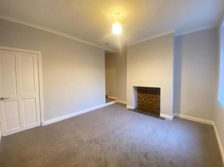 Spacious living room with a uPvc double glazed panelled window to the rear elevation, double panelled radiator, stairs rising to the first floor, recessed fire place with exposed brickwork, newly fitted carpets, decorative glazed panelled door leading into the kitchen.